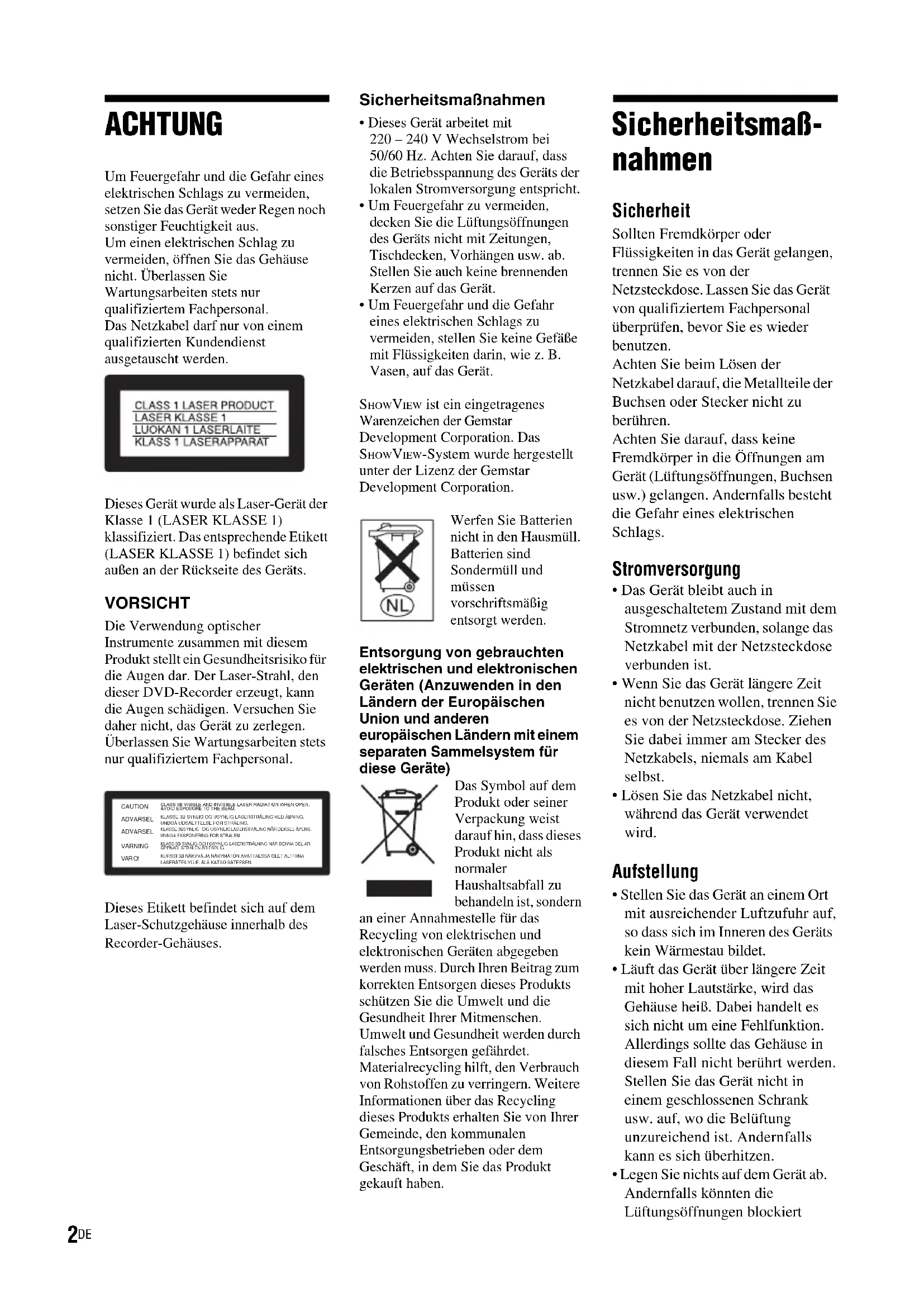 ACHTUNG Um Feuergefahr und die Gefahr eines elektrischen Schlags zu vermeiden, setzen Sie das Gerät weder Regen noch sonstiger Feuchtigkeit aus. Um einen elektrischen Schlag zu vermeiden, öffnen Sie das Gehäuse nicht. Überlassen Sie Wartungsarbeiten stets nur qualifiziertem Fachpersonal.Das Netzkabel darf nur von einem qualifizierten Kundendienst ausgetauscht werden.Dieses Gerät wurde als Laser-Gerät der Klasse 1 (LASER KLASSE 1) klassifiziert. Das entsprechende Etikett (LASER KLASSE 1) befindet sich außen an der Rückseite des Geräts. VORSICHT Die Verwendung optischer Instrumente zusammen mit diesem Produkt stellt ein Gesundheitsrisiko für die Augen dar. Der Laser-Strahl, den dieser DVD-Recorder erzeugt, kann die Augen schädigen. Versuchen Sie daher nicht, das Gerät zu zerlegen.Überlassen Sie Wartungsarbeiten stets nur qualifiziertem Fachpersonal.Dieses Etikett befindet sich auf dem Laser-Schutzgehäuse innerhalb des Recorder-Gehäuses. Sicherheitsmaßnahmen
