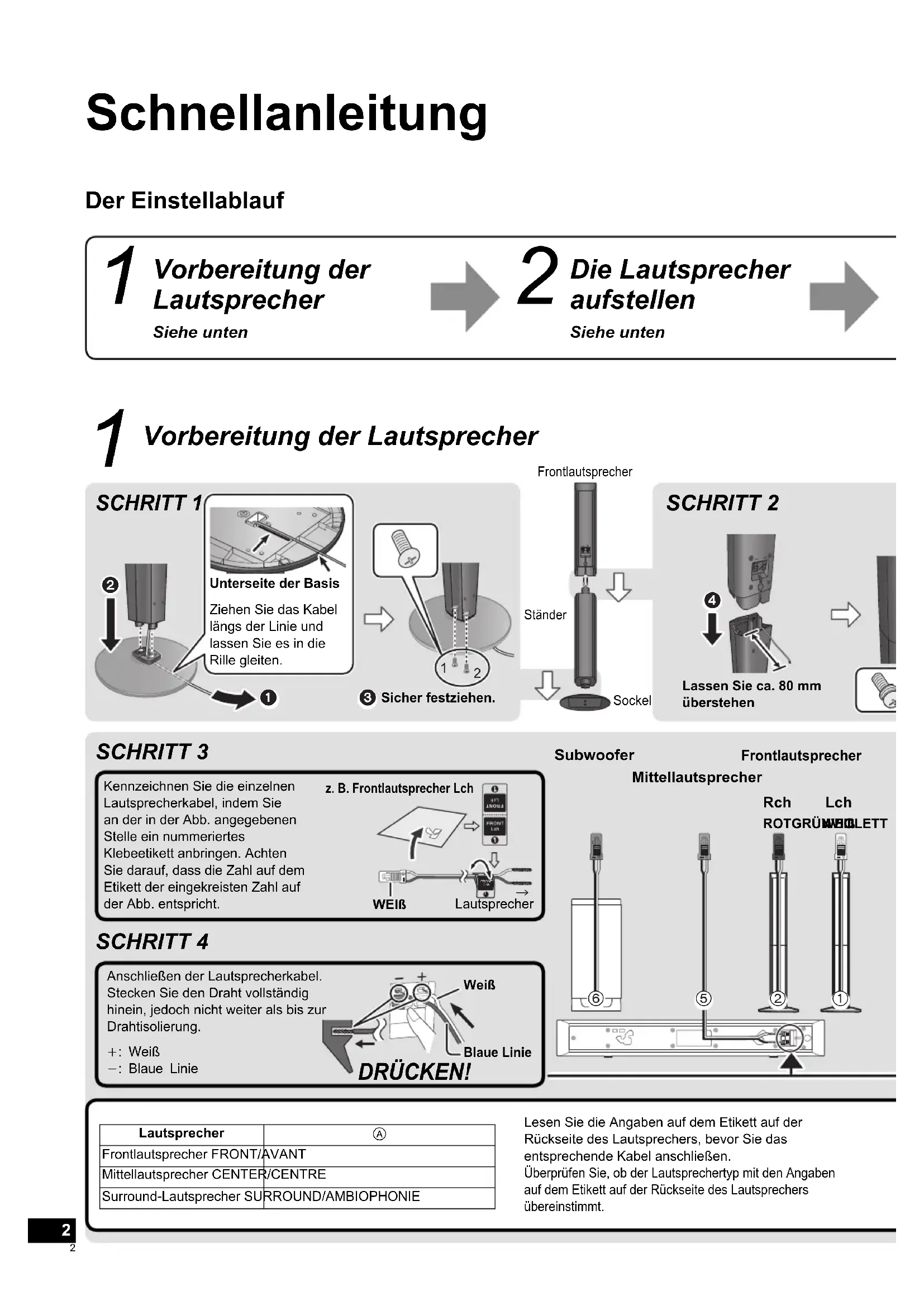Schnellanleitung Der Einstellablauf Vorbereitung der Lautsprecher Siehe unten Die Lautsprecher aufstellen Siehe unten Vorbereitung der Lautsprecher Lesen Sie die Angaben auf dem Etikett auf der Rückseite des Lautsprechers, bevor Sie das entsprechende Kabel anschließen.Überprüfen Sie, ob der Lautsprechertyp mit den Angaben auf dem Etikett auf der Rückseite des Lautsprechers übereinstimmt.Lautsprecher Frontlautsprecher FRONT/AVANTMittellautsprecher CENTER/CENTRESurround-Lautsprecher SURROUND/AMBIOPHONIEKennzeichnen Sie die einzelnen Lautsprecherkabel, indem Sie an der in der Abb. angegebenen Stelle ein nummeriertes Klebeetikett anbringen. Achten Sie darauf, dass die Zahl auf dem Etikett der eingekreisten Zahl auf der Abb. entspricht.Anschließen der Lautsprecherkabel.Stecken Sie den Draht vollständig hinein, jedoch nicht weiter als bis zur Drahtisolierung.: Weiß: Blaue Liniez. B. Frontlautsprecher Lch DRÜCKEN! Frontlautsprecher Mittellautsprecher Subwoofer SCHRITT 3 SCHRITT 4 SCHRITT 1 SCHRITT 2 WEIß Weiß Blaue LinieSicher festziehen.Frontlautsprecher StänderSockelLautsprecher Lch WEIß Rch ROTGRÜNVIOLETTUnterseite der BasisZiehen Sie das Kabel längs der Linie und lassen Sie es in die Rille gleiten.Lassen Sie ca. 80 mm überstehen SCBTT770EG-VQC8274.indb2SCBTT770EG-VQC8274.indb2 2011/01/1411:25:102011/01/1411:25:103