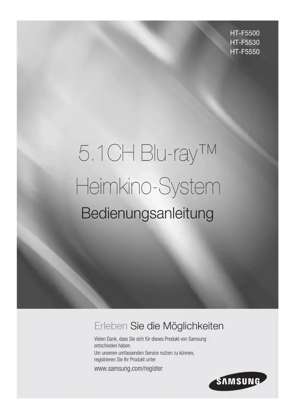 min) www.samsung.com/ch (German) www.samsung.com/ch_fr (French) U.K 0330 SAMSUNG (7267864) www.samsung.com EIRE 0818 717100 www.samsung.com LITHUANIA 8-800-77777 www.samsung.com/lt LATVIA 8000-7267 www.samsung.com/lv ESTONIA 800-7267 www.samsung.com/ee HT-F5500_30_50-XU_FRA_0702.indd 60HT-F5500_30_50-XU_FRA_0702.indd 60 2013-07-02 오전 10:02:472013-07-02 오전 10:02:47HT-F5500 HT-F5530 HT-F5550 Erleben Sie die Möglichkeiten Vielen Dank, dass Sie sich für dieses Produkt von Samsung entschieden haben.Um unseren umfassenden Service nutzen zu können, registrieren Sie Ihr Produkt unter www.samsung.com/register 5.1CH Blu-ray™ Heimkino-System Bedienungsanleitung HT-F5500_30_50-XU_GER_0529.indd 1HT-F5500_30_50-XU_GER_0529.indd 1 2013-05-29 오후 4:34:442013-05-29 오후 4:34:44| 2 Deutsch Sicherheitsinformationen WARNUNG• Schützen Sie das Gerät vor Regen und Feuchtigkeit, um die Gefahr von Bränden oder Stromschlägen zu verringern.ACHTUNG• Das Gerät darf keinen Tropfen oder Spritzern ausgesetzt werden. Außerdem dürfen keine mit Flüssigkeiten gefüllte Behälter, wie beispielsweise Vasen, darauf abgestellt werden.• Um das Gerät vom Netz zu trennen, muss der Netzstecker aus der Steckdose gezogen werden. Stellen Sie deshalb sicher, dass Sie den Netzstecker stets leicht erreichen können.• Dieses Gerät muss stets an geerdete Steckdosen angeschlossen werden.• Entfernen Sie den Stecker aus der Steckdose, um das Gerät vollständig abzuschalten. Aus diesem Grund sollte sich der Netzstecker in Reichweite befinden. Warnung ZUR VERMEIDUNG VON STROMSCHLÄGEN DARF DIESES GERÄT NICHT GEÖFFNET WERDEN.ES ENTHÄLT KEINE BAUTEILE, DIE VOM BENUTZER GEWARTET WERDEN KÖNNEN. LASSEN SIE REPARATUREN NUR VON QUALIFIZIERTEM FACHPERSONAL DURCHFÜHREN. ACHTUNG STROMSCHLAGGEFAHR!NICHT ÖFFNEN!Dieses Symbol weist auf „gefährliche Netzspannung“ im Inneren des Geräts hin. Es besteht somit die Gefahr von Stromschlägen und Verletzungen.ACHTUNG: UM STROMSCHLÄGE ZU VERMEIDEN, RICHTEN SIE DEN BREITEN KONTAKTSTIFT DES STECKERS VOLLIG AN DEM BREITEN STECKPLATZ AUS.Dieses Symbol weist auf wichtige Anweisungen im Begleitmaterial zum Produkt hin.CLASS 1 LASER PRODUCTKLASSE 1 LASER PRODUKT LUOKAN 1 LASER LAITEKLASS 1 LASER APPARATPRODUCTO LÁSER CLASE 1LASERPRODUKT DER KLASSE 1Dieser CD-Player ist ein LASERPRODUKT DER KLASSE 1. Bei Verwendung von Bedienelementen bzw. Einstellungen und Vorgängen, die von den hier aufgeführten abweichen, kann ein Risiko durch gefährliche Strahlung entstehen.ACHTUNG• INVISIBLE LASER RADIATION WHEN OPEN AND INTERLOCKS DEFEATED, AVOID EXPOSURE TO BEAM. HT-F5500_30_50-XU_GER_0529.indd 2HT-F5500_30_50-XU_GER_0529.indd 2 2013-05-29 오후 4:34:492013-05-29 오후 4:34:49Deutsch 3