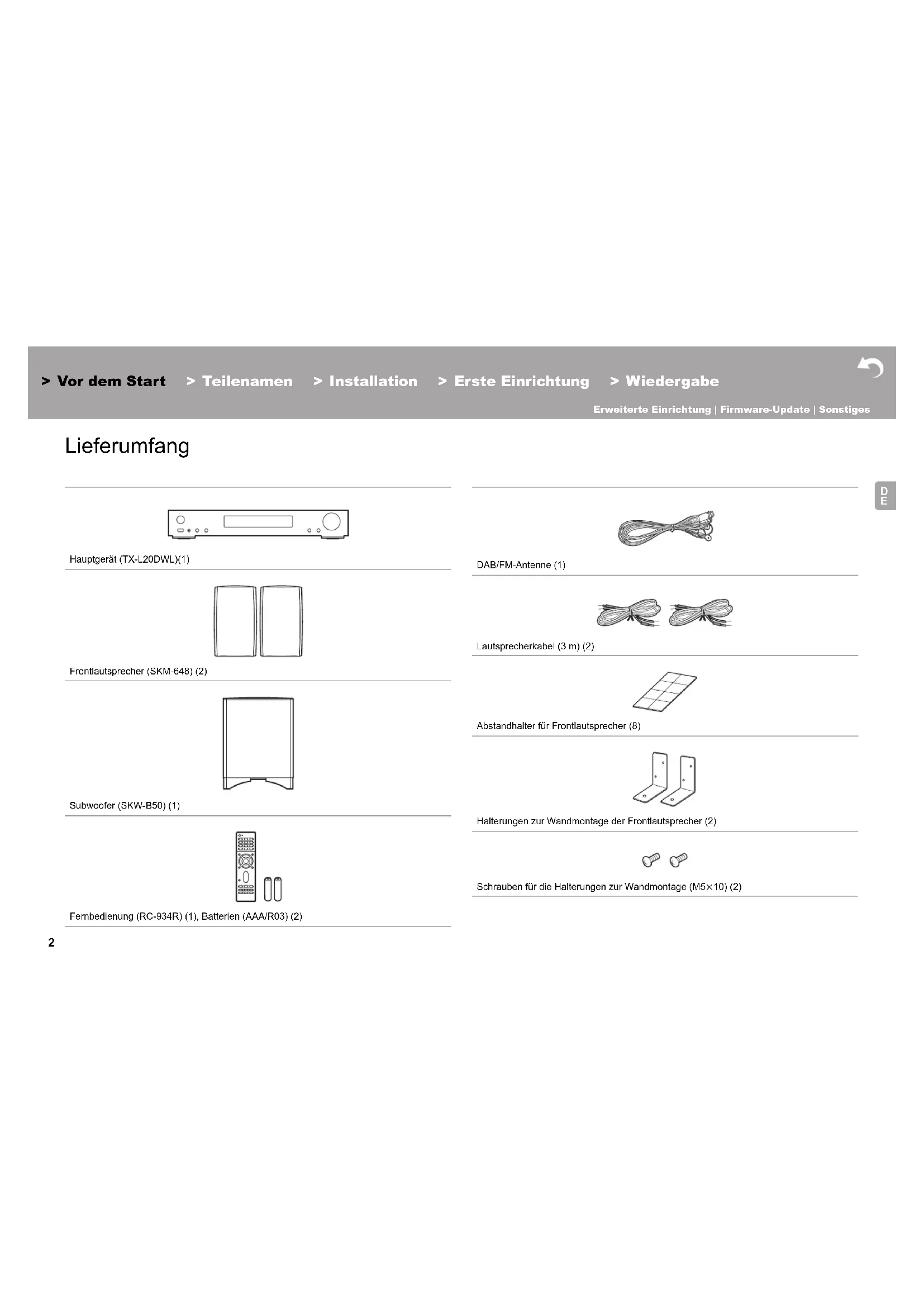 Vor dem Start Lieferumfang Hauptgerät (TX-L20DWL)(1) Frontlautsprecher (SKM-648) (2) Subwoofer (SKW-B50) (1) Fernbedienung (RC-934R) (1), Batterien (AAA/R03) (2) DAB/FM-Antenne (1) Lautsprecherkabel (3 m) (2) Abstandhalter für Frontlautsprecher (8) Halterungen zur Wandmontage der Frontlautsprecher (2) Schrauben für die Halterungen zur Wandmontage (M5k10) (2)3 > Vor dem Start > Teilenamen > Installation > Erste Einrichtung > Wiedergabe Erweiterte Einrichtung | Firmware-Update | Sonstiges