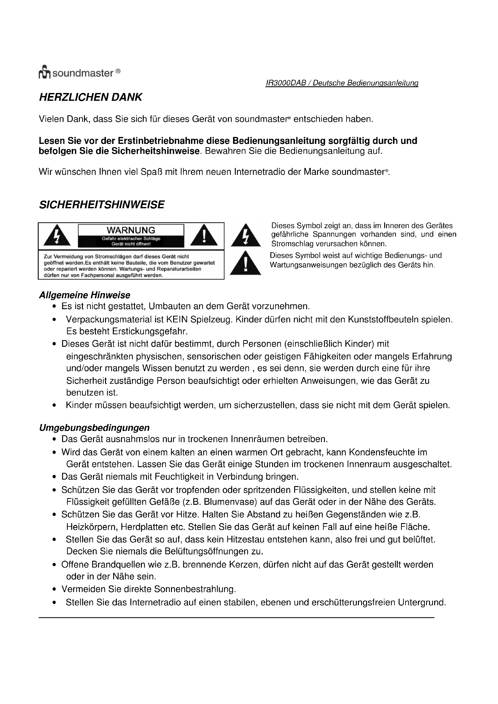 Vielen Dank, dass Sie sich für dieses Gerät von soundmaster® entschieden haben.