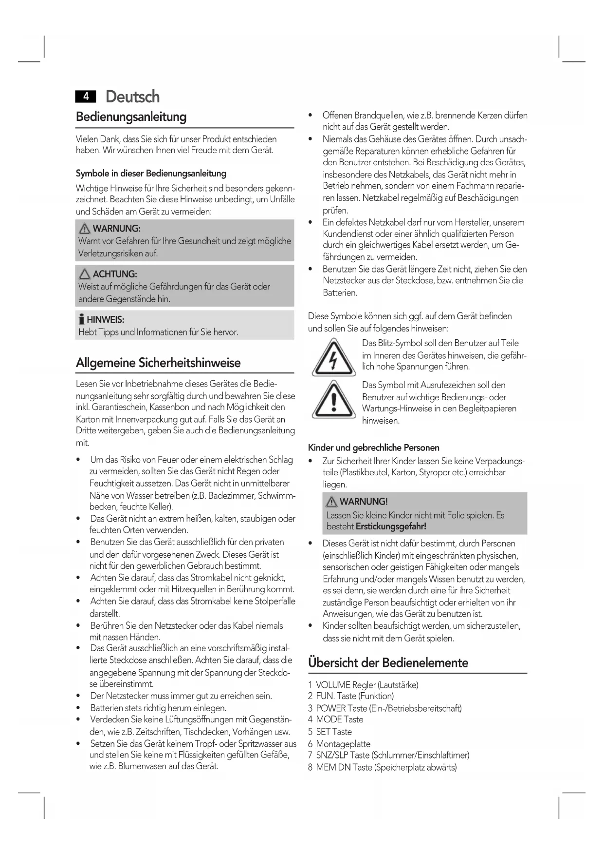 - Kindersolltenbeaufsichtigtwerden,umsicherzustellen, dass sie nicht mit dem Gerät spielen. Übersicht der Bedienelemente 1 VOLUME Regler (Lautstärke) 2 FUN. Taste (Funktion) 3 POWER Taste (Ein-/Betriebsbereitschaft) 4 MODE Taste 5 SET Taste 6 Montageplatte 7 SNZ/SLP Taste (Schlummer/Einschlaftimer) 8 MEM DN Taste (Speicherplatz abwärts)Deutsch