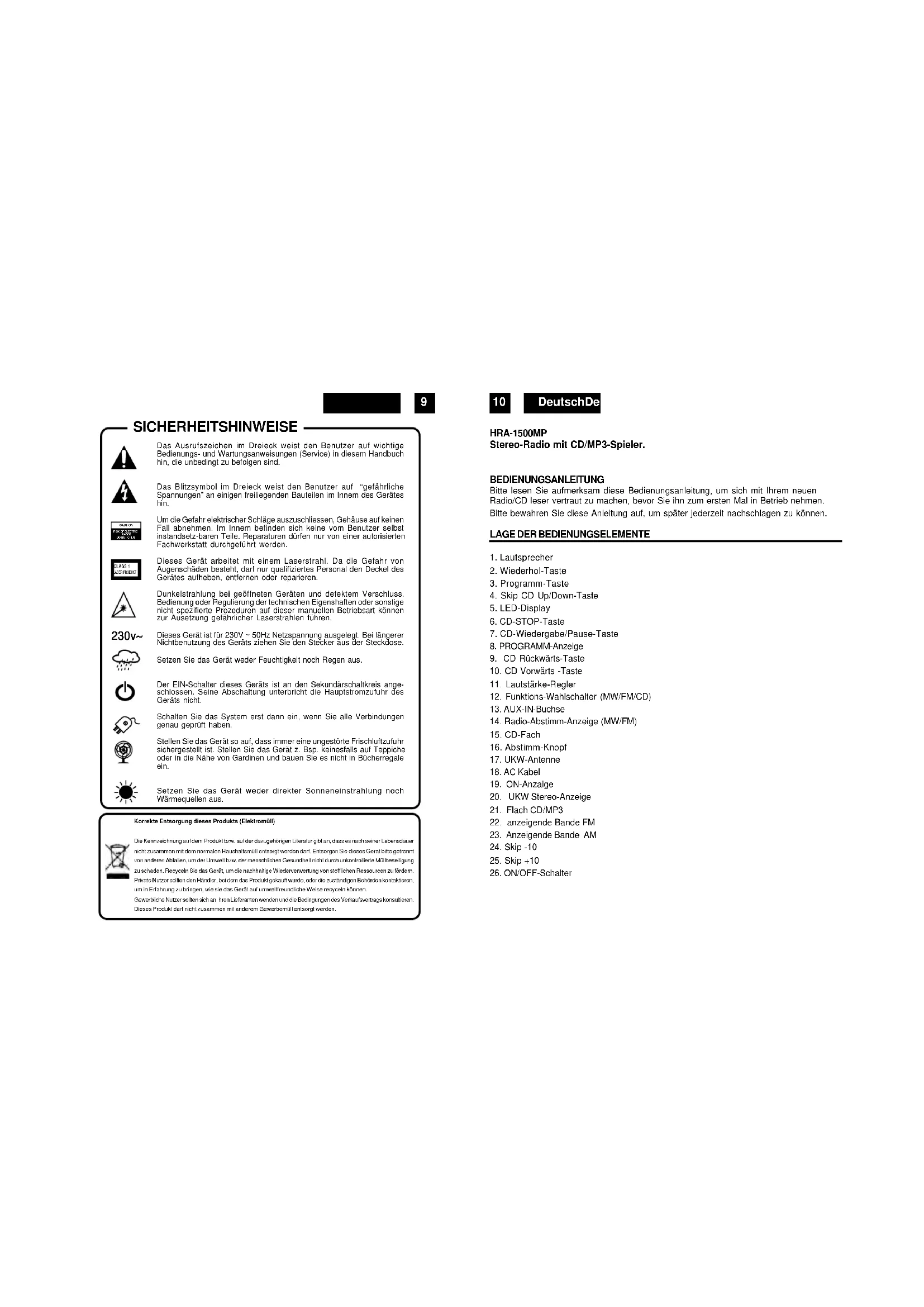 HRA-1500MP Stereo-Radio mit CD/MP3-Spieler. BEDIENUNGSANLEITUNG Bitte lesen Sie aufmerksam diese Bedienungsanleitung, um sich mit Ihrem neuen Radio/CD leser vertraut zu machen, bevor Sie ihn zum ersten Mal in Betrieb nehmen. Bitte bewahren Sie diese Anleitung auf, um später jederzeit nachschlagen zu können.