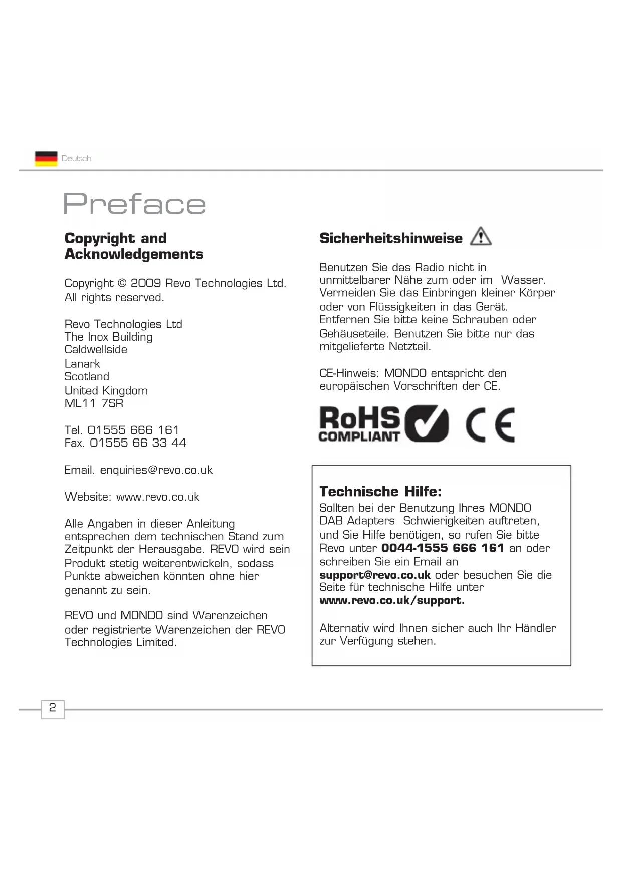 Sollten bei der Benutzung Ihres MONDO DAB Adapters Schwierigkeiten aufreten, und Sie Hilfe benötigen, so rufen Sieitte Revo unter 0044-1555 666 161 an oder schreiben Sie ein Email an support@revo.co.uk oder besuchen Sie die Seite für technische Hilfe unter www.revo.co.uk/support.