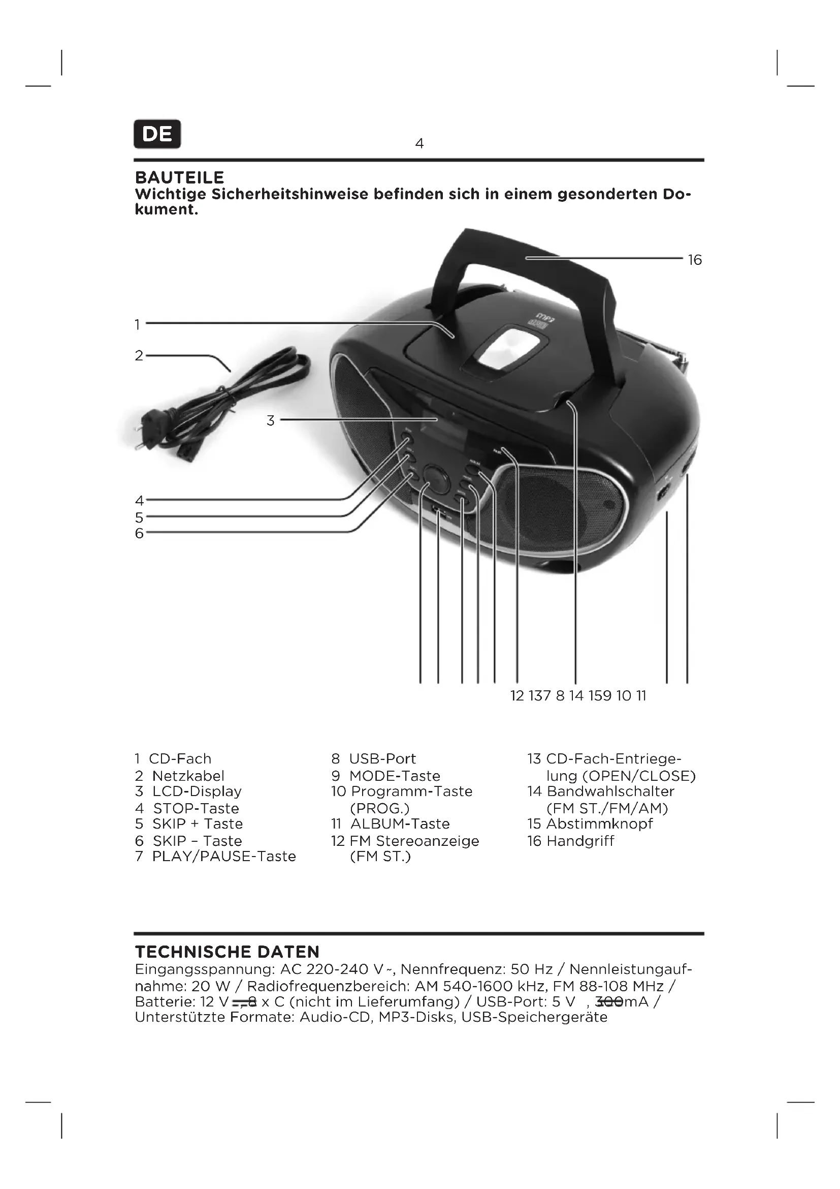 , Nennfrequenz: 50 Hz / Nennleistungauf- nahme: 20 W / Radiofrequenzbereich: AM 540-1600 kHz, FM 88-108 MHz / Batterie: 12 V , 8 x C (nicht im Lieferumfang) / USB-Port: 5 V , 300mA / Unterstützte Formate: Audio-CD, MP3-Disks, USB-Speichergeräte TECHNISCHE DATEN Wichtige Sicherheitshinweise befinden sich in einem gesonderten Do- kument.