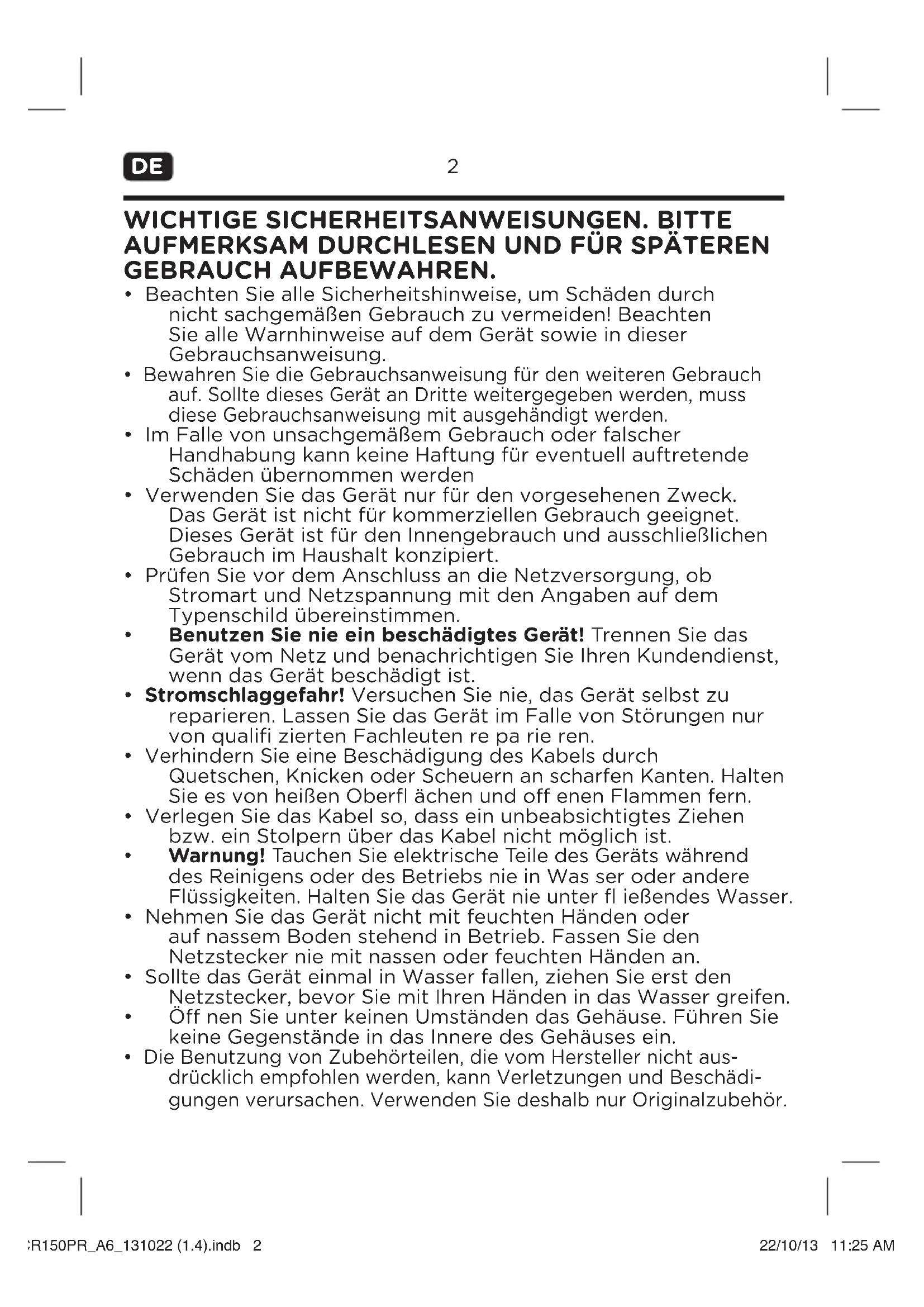 - Die Benutzung von Zubehörteilen, die vom Hersteller nicht aus- drücklich empfohlen werden, kann Verletzungen und Beschädi- gungen verursachen. Verwenden Sie deshalb nur Originalzubehör. OCR150PR_A6_131022 (1.4).indb 2CR150PR_A6_131022 (1.4).indb 2 22/10/13 11:25 AM22/10/13 11:25 AMDE