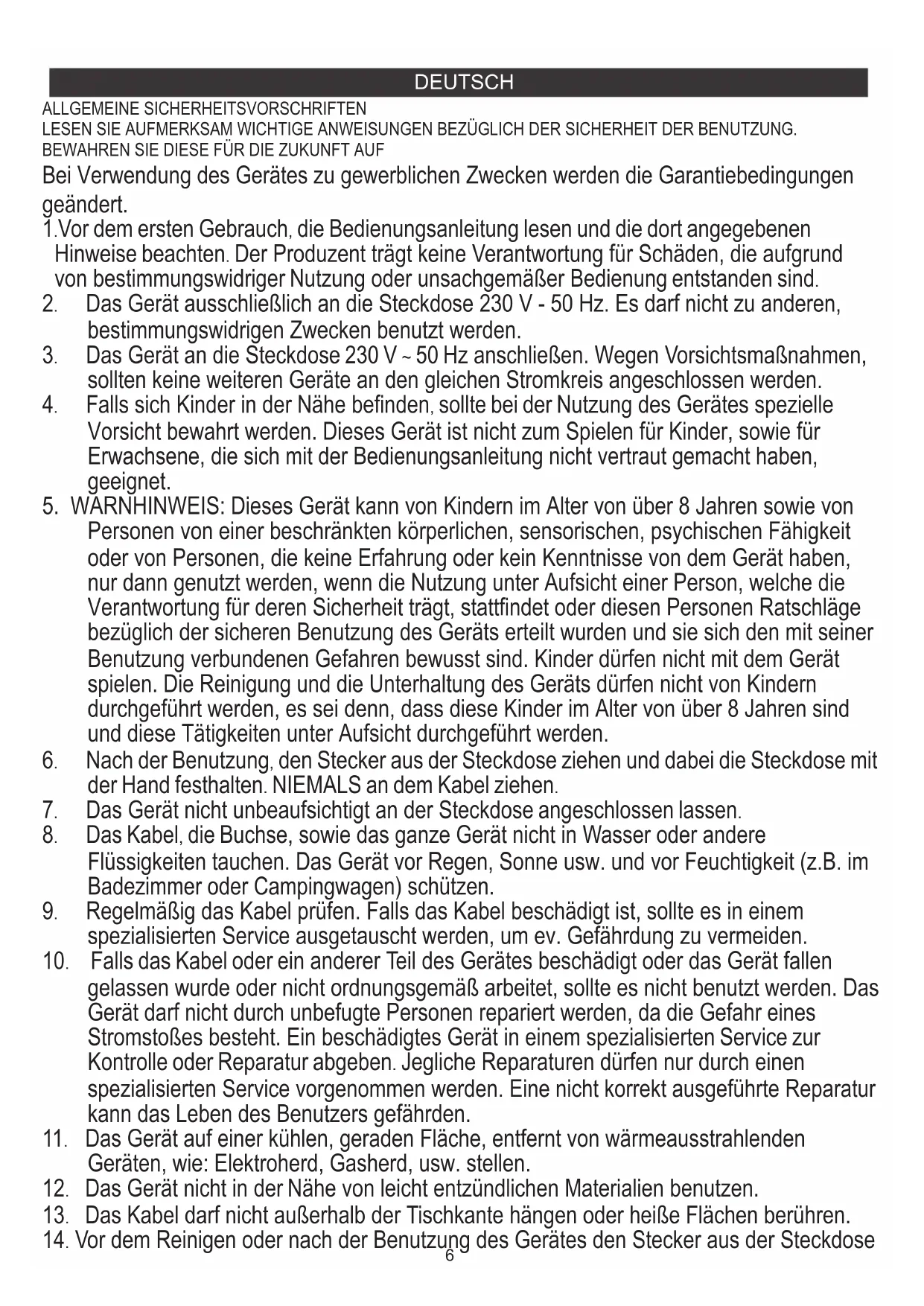 14. Vor dem Reinigen oder nach der Benutzung des Gerätes den Stecker aus der Steckdose