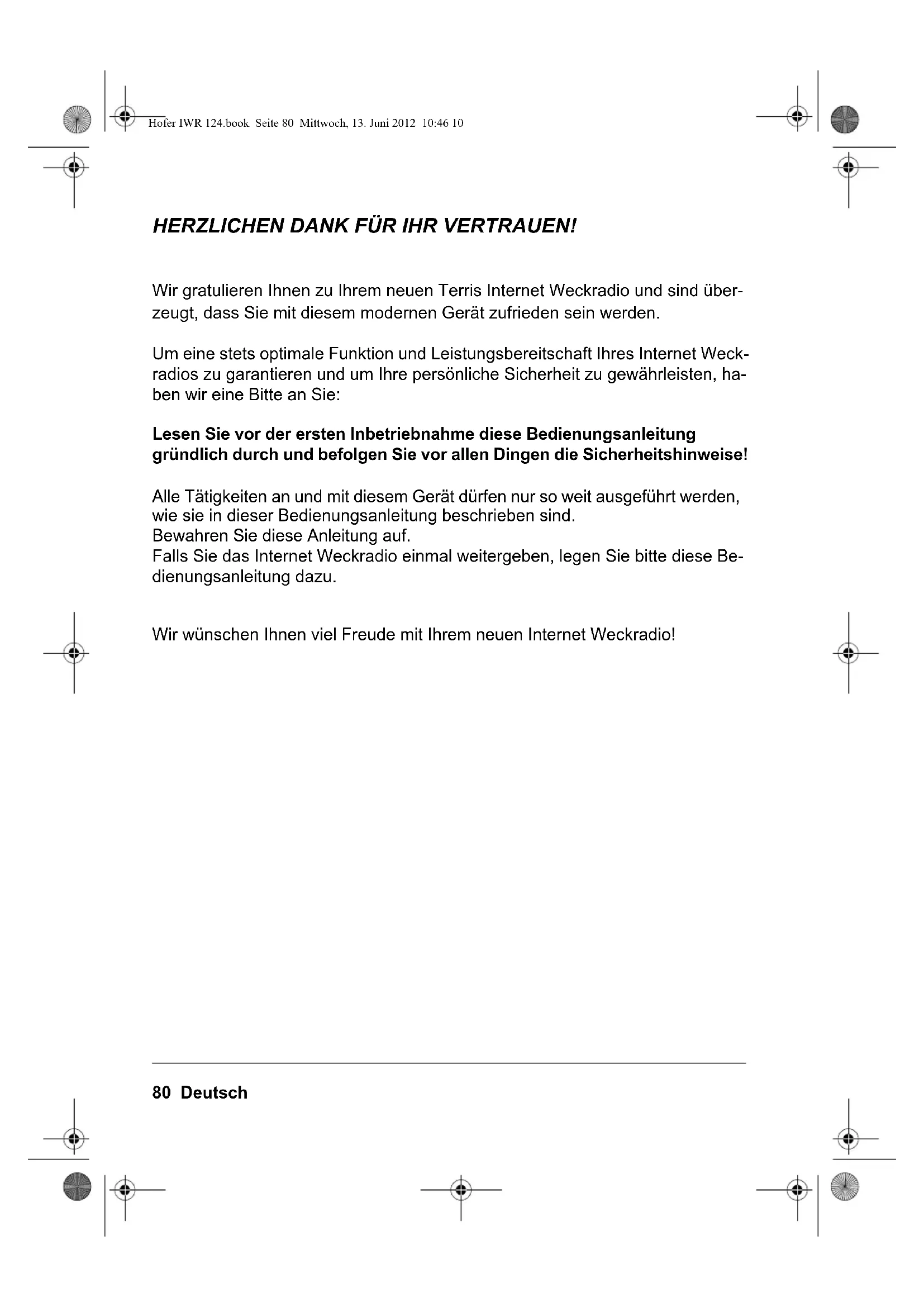 Hofer IWR 124.book Seite 79 Mittwoch, 13. Juni 2012 10:46 1080 Deutsch HERZLICHEN DANK FÜR IHR VERTRAUEN! Wir gratulieren Ihnen zu Ihrem neuen Terris Internet Weckradio und sind über- zeugt, dass Sie mit diesem modernen Gerät zufrieden sein werden. Um eine stets optimale Funktion und Leistungsbereitschaft Ihres Internet Weck- radios zu garantieren und um Ihre persönliche Sicherheit zu gewährleisten, ha- ben wir eine Bitte an Sie: Lesen Sie vor der ersten Inbetriebnahme diese Bedienungsanleitung gründlich durch und befolgen Sie vor allen Dingen die Sicherheitshinweise! Alle Tätigkeiten an und mit diesem Gerät dürfen nur so weit ausgeführt werden, wie sie in dieser Bedienungsanleitung beschrieben sind. Bewahren Sie diese Anleitung auf. Falls Sie das Internet Weckradio einmal weitergeben, legen Sie bitte diese Be- dienungsanleitung dazu. Wir wünschen Ihnen viel Freude mit Ihrem neuen Internet Weckradio! Hofer IWR 124.book Seite 80 Mittwoch, 13. Juni 2012 10:46 10Deutsch 81