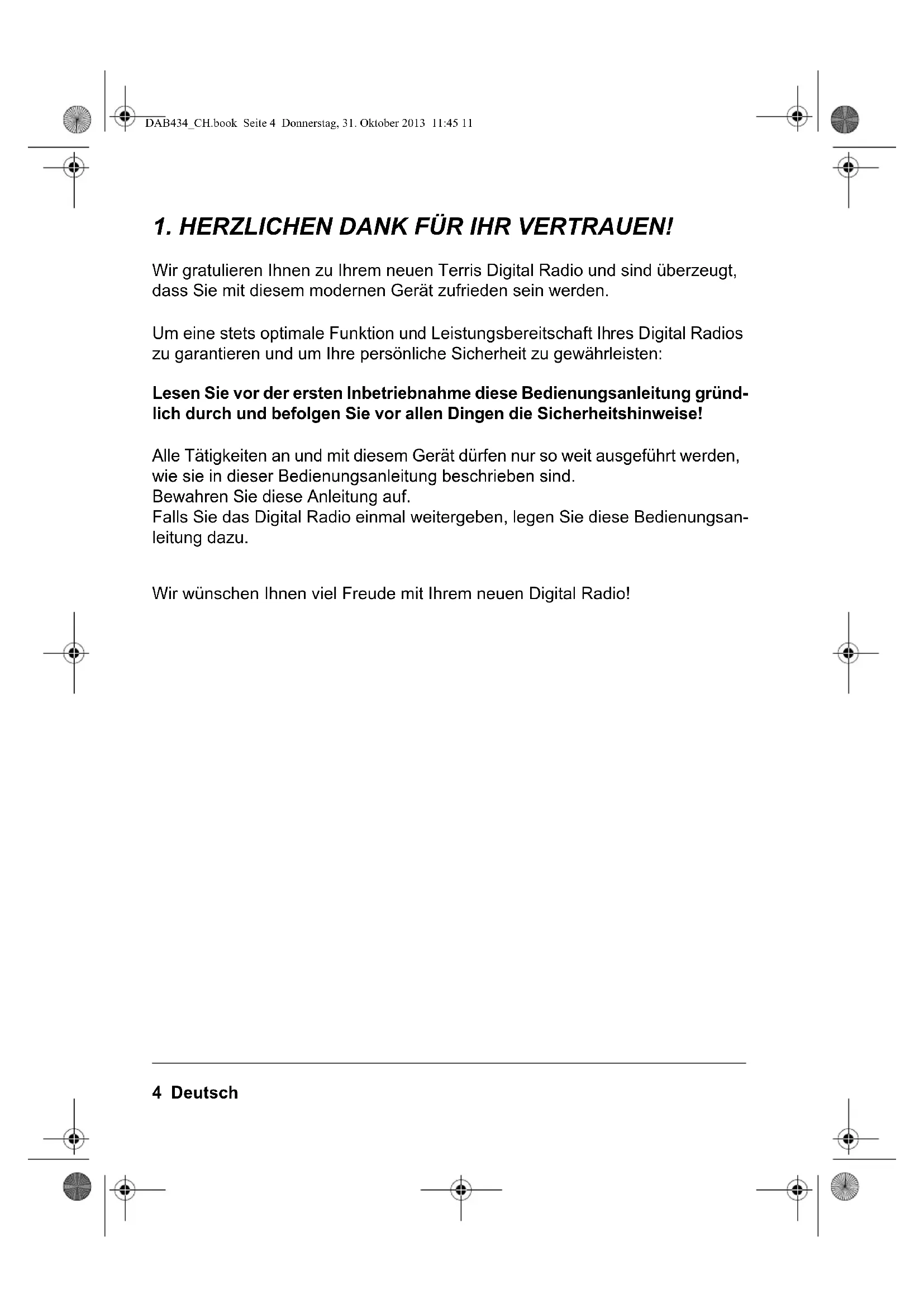 Wir gratulieren Ihnen zu Ihrem neuen Terris Digital Radio und sind überzeugt, dass Sie mit diesem modernen Gerät zufrieden sein werden. Um eine stets optimale Funktion und Leistungsbereitschaft Ihres Digital Radios zu garantieren und um Ihre persönliche Sicherheit zu gewährleisten: Lesen Sie vor der ersten Inbetriebnahme diese Bedienungsanleitung gründ- lich durch und befolgen Sie vor allen Dingen die Sicherheitshinweise! Alle Tätigkeiten an und mit diesem Gerät dürfen nur so weit ausgeführt werden, wie sie in dieser Bedienungsanleitung beschrieben sind. Bewahren Sie diese Anleitung auf. Falls Sie das Digital Radio einmal weitergeben, legen Sie diese Bedienungsan- leitung dazu. Wir wünschen Ihnen viel Freude mit Ihrem neuen Digital Radio! DAB434_CH.book Seite 4 Donnerstag, 31. Oktober 2013 11:45 11Deutsch 5