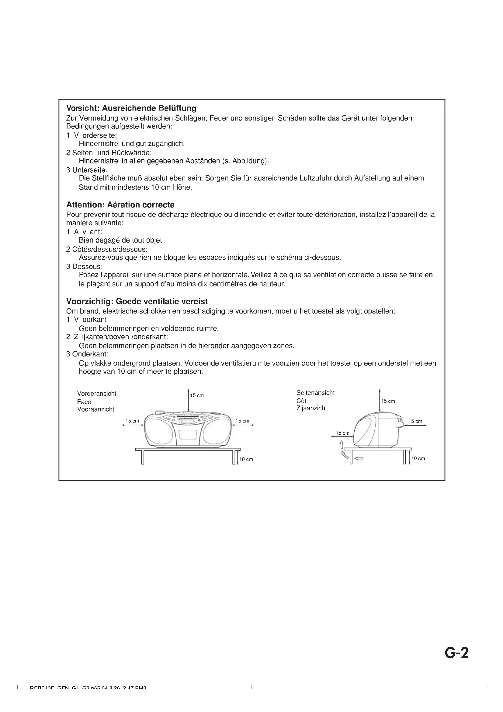 AANGEBRACHT. RCBF10E_GFN_G1_G3.p65 04.8.26, 2:47 PM2G-2 Vorsicht: Ausreichende Belüftung Zur Vermeidung von elektrischen Schlägen, Feuer und sonstigen Schäden sollte das Gerät unter folgenden Bedingungen aufgestellt werden: 1Vorderseite: Hindernisfrei und gut zugänglich. 2 Seiten- und Rückwände: Hindernisfrei in allen gegebenen Abständen (s. Abbildung). 3 Unterseite: Die Stellfläche muß absolut eben sein. Sorgen Sie für ausreichende Luftzufuhr durch Aufstellung auf einem Stand mit mindestens 10 cm Höhe. Attention: Aération correcte Pour prévenir tout risque de décharge électrique ou d’incendie et éviter toute détérioration, installez l’appareil de la manière suivante: 1Avant: Bien dégagé de tout objet. 2 Côtés/dessus/dessous: Assurez-vous que rien ne bloque les espaces indiqués sur le schéma ci-dessous. 3 Dessous: Posez l’appareil sur une surface plane et horizontale. Veillez à ce que sa ventilation correcte puisse se faire en le plaçant sur un support d’au moins dix centimètres de hauteur. Voorzichtig: Goede ventilatie vereist Om brand, elektrische schokken en beschadiging te voorkomen, moet u het toestel als volgt opstellen: 1Voorkant: Geen belemmeringen en voldoende ruimte. 2Zijkanten/boven-/onderkant: Geen belemmeringen plaatsen in de hieronder aangegeven zones. 3 Onderkant: Op vlakke ondergrond plaatsen. Voldoende ventilatieruimte voorzien door het toestel op een onderstel met een hoogte van 10 cm of meer te plaatsen. Vorderansicht Face Vooraanzicht 15 cm15 cm15 cm10 cm Seitenansicht Côt Zijaanzicht 15 cm15 cm15 cm10 cm RCBF10E_GFN_G1_G3.p65 04.8.26, 2:47 PM3G-3