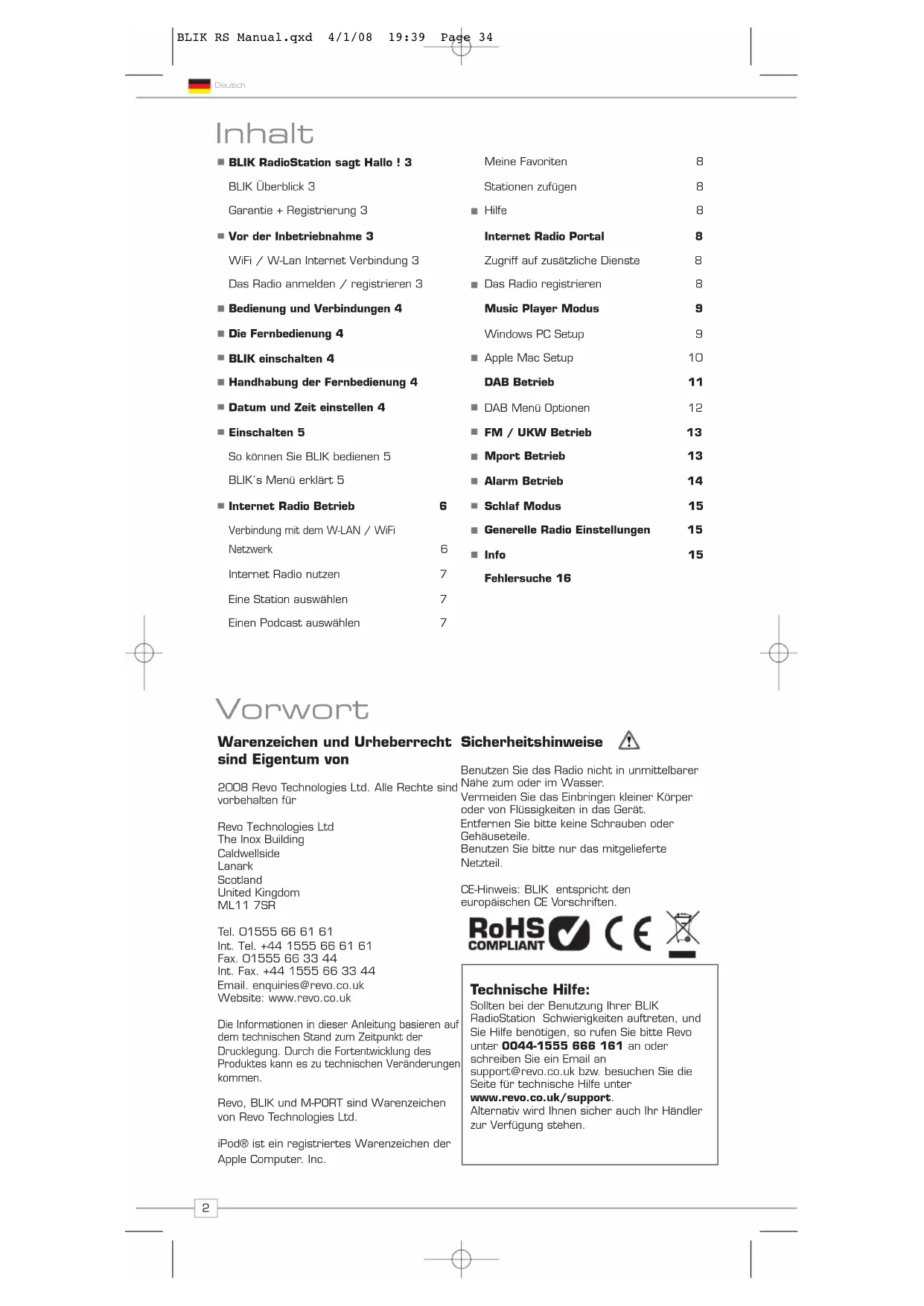 Internet Radio nutzen 7 Eine Station auswählen 7 Einen Podcast auswählen 7 Meine Favoriten 8 Stationen zufügen 8 Hilfe 8 Internet Radio Portal 8 Zugriff auf zusätzliche Dienste 8 Das Radio registrieren 8 Music Player Modus 9 Windows PC Setup 9 Apple Mac Setup 10 DAB Betrieb 11 DAB Menü Optionen 12 FM / UKW Betrieb 13 Mport Betrieb 13 Alarm Betrieb 14 Schlaf Modus 15 Generelle Radio Einstellungen 15 Info 15 Fehlersuche 16 Warenzeichen und Urheberrecht sind Eigentum von 2008 Revo Technologies Ltd. Alle Rechte sind vorbehalten für Revo Technologies Ltd The Inox Building Caldwellside Lanark Scotland United Kingdom ML11 7SR Tel. 01555 66 61 61 Int. Tel. +44 1555 66 61 61 Fax. 01555 66 33 44 Int. Fax. +44 1555 66 33 44 Email. enquiries@revo.co.uk Website: www.revo.co.uk Die Informationen in dieser Anleitung basieren auf dem technischen Stand zum Zeitpunkt der Drucklegung. Durch die Fortentwicklung des Produktes kann es zu technischen Veränderungen kommen. Revo, BLIK und M-PORT sind Warenzeichen von Revo Technologies Ltd. iPod® ist ein registriertes Warenzeichen der Apple Computer. Inc. Sicherheitshinweise Benutzen Sie das Radio nicht in unmittelbarer Nähe zum oder im Wasser. Vermeiden Sie das Einbringen kleiner Körper oder von Flüssigkeiten in das Gerät. Entfernen Sie bitte keine Schrauben oder Gehäuseteile. Benutzen Sie bitte nur das mitgelieferte Netzteil. CE-Hinweis: BLIK entspricht den europäischen CE Vorschriften. Technische Hilfe: Sollten bei der Benutzung Ihrer BLIK RadioStation Schwierigkeiten auftreten, und Sie Hilfe benötigen, so rufen Sie bitte Revo unter 0044-1555 666 161 an oder schreiben Sie ein Email an support@revo.co.uk bzw. besuchen Sie die Seite für technische Hilfe unter www.revo.co.uk/support. Alternativ wird Ihnen sicher auch Ihr Händler zur Verfügung stehen. Vorwort
