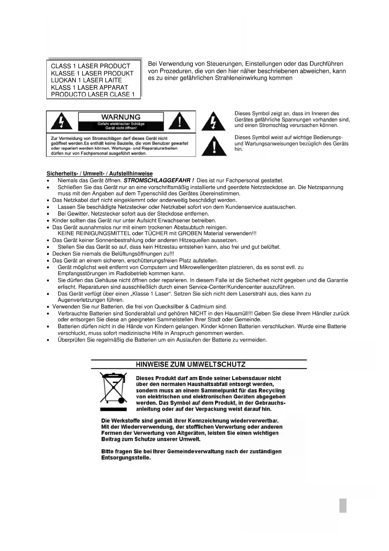 Das Gerat verfugt über einen „Klasse 1 Laser". Setzen Sie sich nicht dem Laserstrahl aus, dies kann zu Augenverletzungen führen. - Verwenden Sie nur Batterien, die frei von Quecksilber & Cadmium sind.