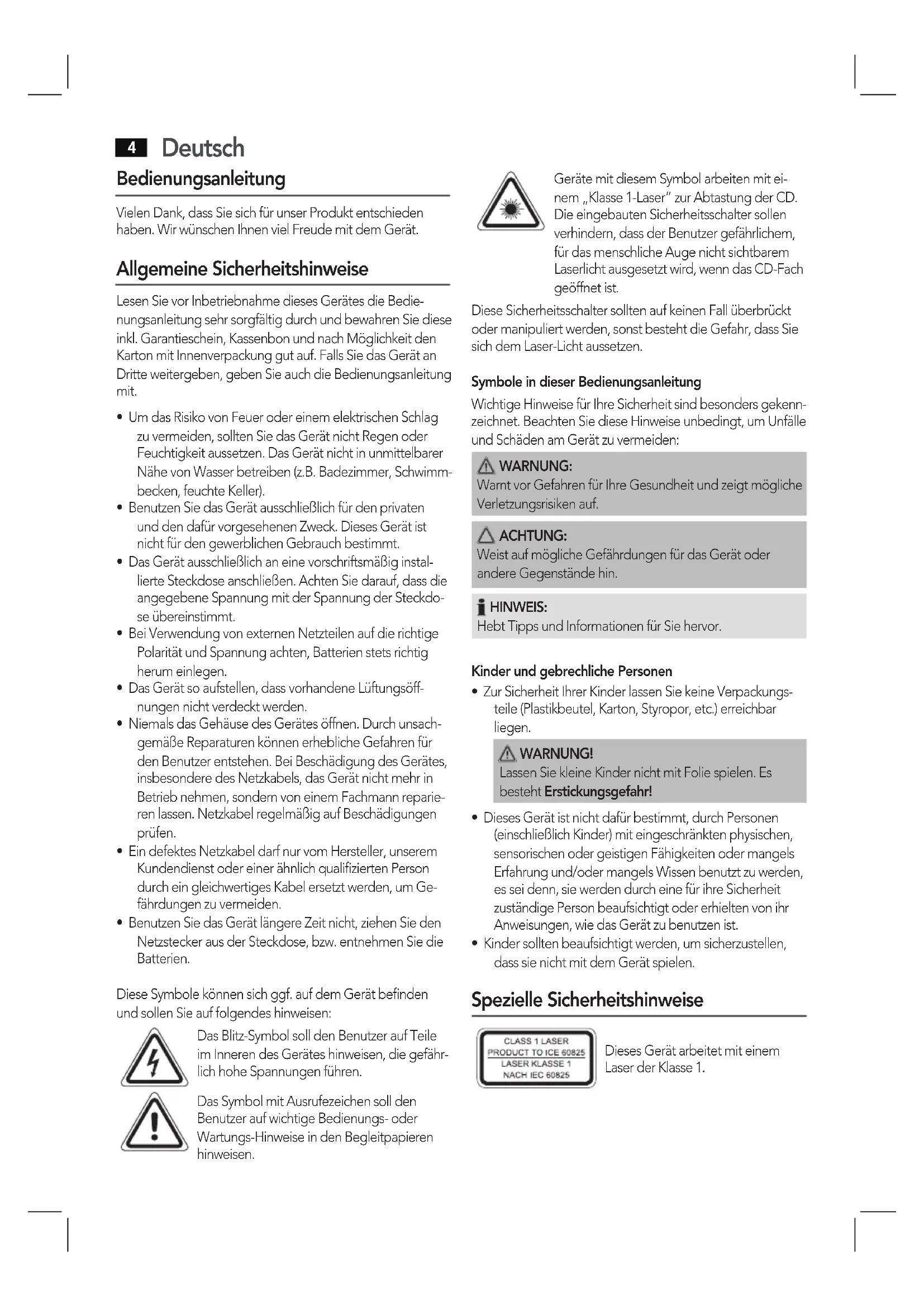 - Benutzen Sie das Gerät längere Zeit nicht, ziehen Sie den Netzstecker aus der Steckdose, bzw. entnehmen Sie die Batterien. Diese Symbole können sich ggf. auf dem Gerät befinden und sollen Sie auf folgendes hinweisen: Das Blitz-Symbol soll den Benutzer auf Teile im Inneren des Gerätes hinweisen, die gefähr- lich hohe Spannungen führen. Das Symbol mit Ausrufezeichen soll den Benutzer auf wichtige Bedienungs- oder Wartungs-Hinweise in den Begleitpapieren hinweisen. Geräte mit diesem Symbol arbeiten mit ei- nem „Klasse 1-Laser“ zur Abtastung der CD. Die eingebauten Sicherheitsschalter sollen verhindern, dass der Benutzer gefährlichem, für das menschliche Auge nicht sichtbarem Laserlicht ausgesetzt wird, wenn das CD-Fach geöffnet ist. Diese Sicherheitsschalter sollten auf keinen Fall überbrückt oder manipuliert werden, sonst besteht die Gefahr, dass Sie sich dem Laser-Licht aussetzen. Symbole in dieser Bedienungsanleitung Wichtige Hinweise für Ihre Sicherheit sind besonders gekenn- zeichnet. Beachten Sie diese Hinweise unbedingt, um Unfälle und Schäden am Gerät zu vermeiden: WARNUNG: Warnt vor Gefahren für Ihre Gesundheit und zeigt mögliche Verletzungsrisiken auf. ACHTUNG: Weist auf mögliche Gefährdungen für das Gerät oder andere Gegenstände hin. HINWEIS: Hebt Tipps und Informationen für Sie hervor. Kinder und gebrechliche Personen