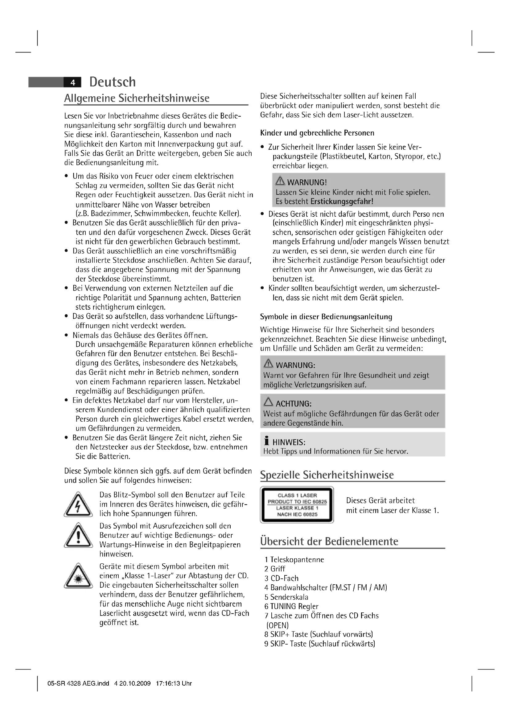 - Kinder sollten beaufsichtigt werden, um sicherzustel- len, dass sie nicht mit dem Gerät spielen. Symbole in dieser Bedienungsanleitung Wichtige Hinweise für Ihre Sicherheit sind besonders gekennzeichnet. Beachten Sie diese Hinweise unbedingt, um Unfälle und Schäden am Gerät zu vermeiden: WARNUNG: Warnt vor Gefahren für Ihre Gesundheit und zeigt mögliche Verletzungsrisiken auf. ACHTUNG: Weist auf mögliche Gefährdungen für das Gerät oder andere Gegenstände hin. HINWEIS: Hebt Tipps und Informationen für Sie hervor. Spezielle Sicherheitshinweise Dieses Gerät arbeitet mit einem Laser der Klasse 1. Übersicht der Bedienelemente 1 Teleskopantenne 2 Gri 3 CD-Fach 4 Bandwahlschalter (FM.ST / FM / AM) 5 Senderskala 6 TUNING Regler 7 Lasche zum Önen des CD Fachs (OPEN) 8 SKIP+ Taste (Suchlauf vorwärts) 9 SKIP- Taste (Suchlauf rückwärts) 05-SR 4328 AEG.indd 4 20.10.2009 17:16:13 UhrDeutsch