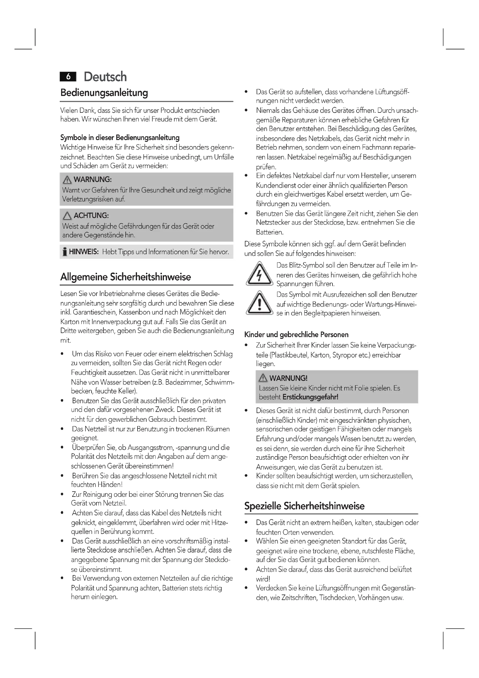- BenutzenSiedasGerätlängereZeitnicht,ziehenSieden Netzstecker aus der Steckdose, bzw. entnehmen Sie die Batterien. Diese Symbole können sich ggf. auf dem Gerät befinden und sollen Sie auf folgendes hinweisen: Das Blitz-Symbol soll den Benutzer auf Teile im In- neren des Gerätes hinweisen, die gefährlich hohe Spannungen führen. Das Symbol mit Ausrufezeichen soll den Benutzer auf wichtige Bedienungs- oder Wartungs-Hinwei- se in den Begleitpapieren hinweisen. Kinder und gebrechliche Personen