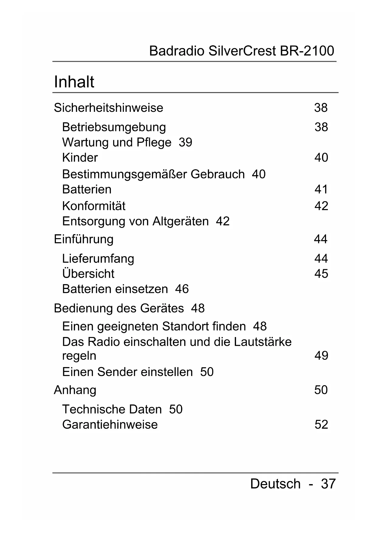 Deutsch - 37 Inhalt Sicherheitshinweise 38 Betriebsumgebung 38 Wartung und Pflege 39 Kinder 40 Bestimmungsgemäßer Gebrauch 40 Batterien 41 Konformität 42 Entsorgung von Altgeräten 42 Einführung 44 Lieferumfang 44 Übersicht 45 Batterien einsetzen 46 Bedienung des Gerätes 48 Einen geeigneten Standort finden 48 Das Radio einschalten und die Lautstärke regeln 49 Einen Sender einstellen 50 Anhang 50 Technische Daten 50 Garantiehinweise 52Badradio SilverCrest BR-2100