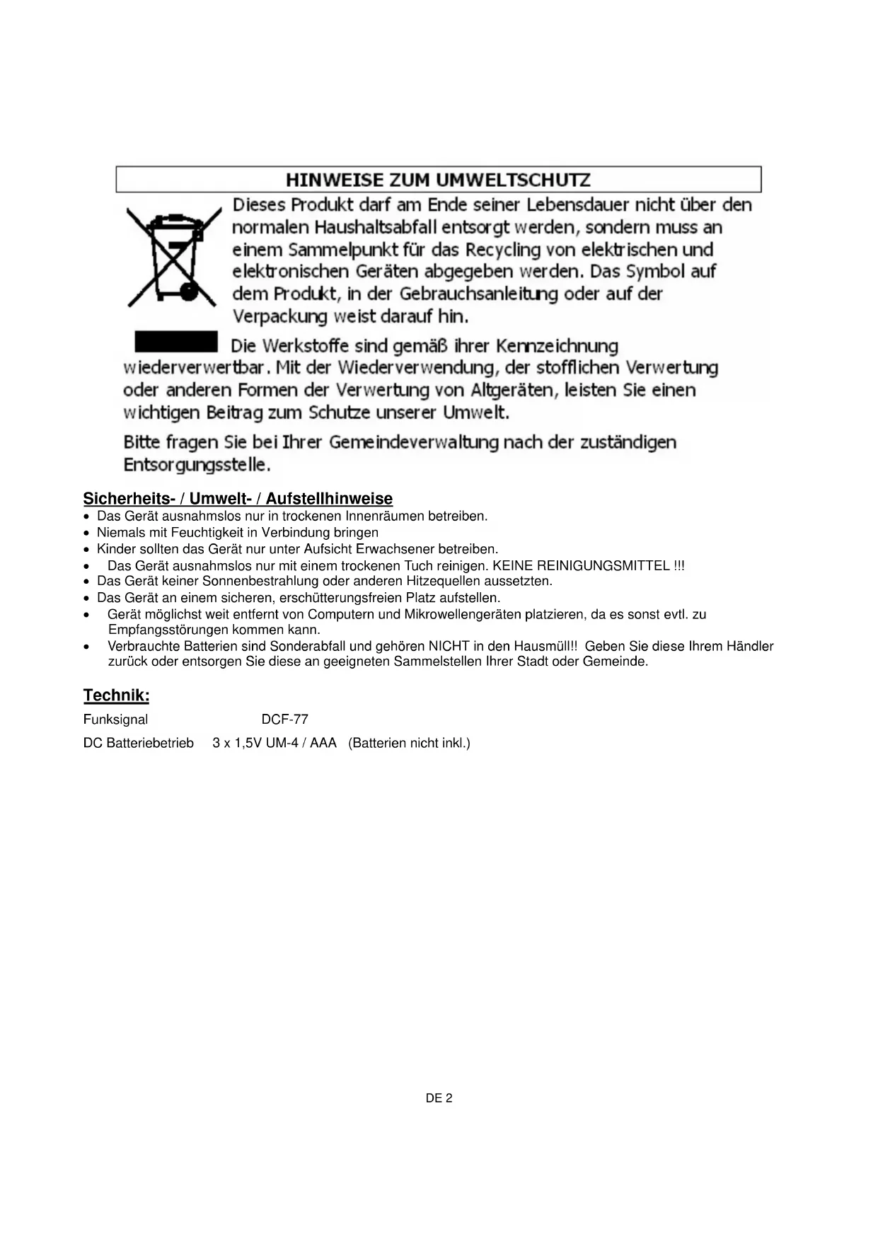 Dieses Gerät ist mit einem Empfänger zum Empfang des Funksignals DCF-77 aus Frankfurt a.M., Deutschland ausgestattet, dass automatisch die Zeit bzw. Datum einstellt. Das DCF-77 Signal wird in einem Umkreis von ca. 1.500 km um Frankfurt empfangen.