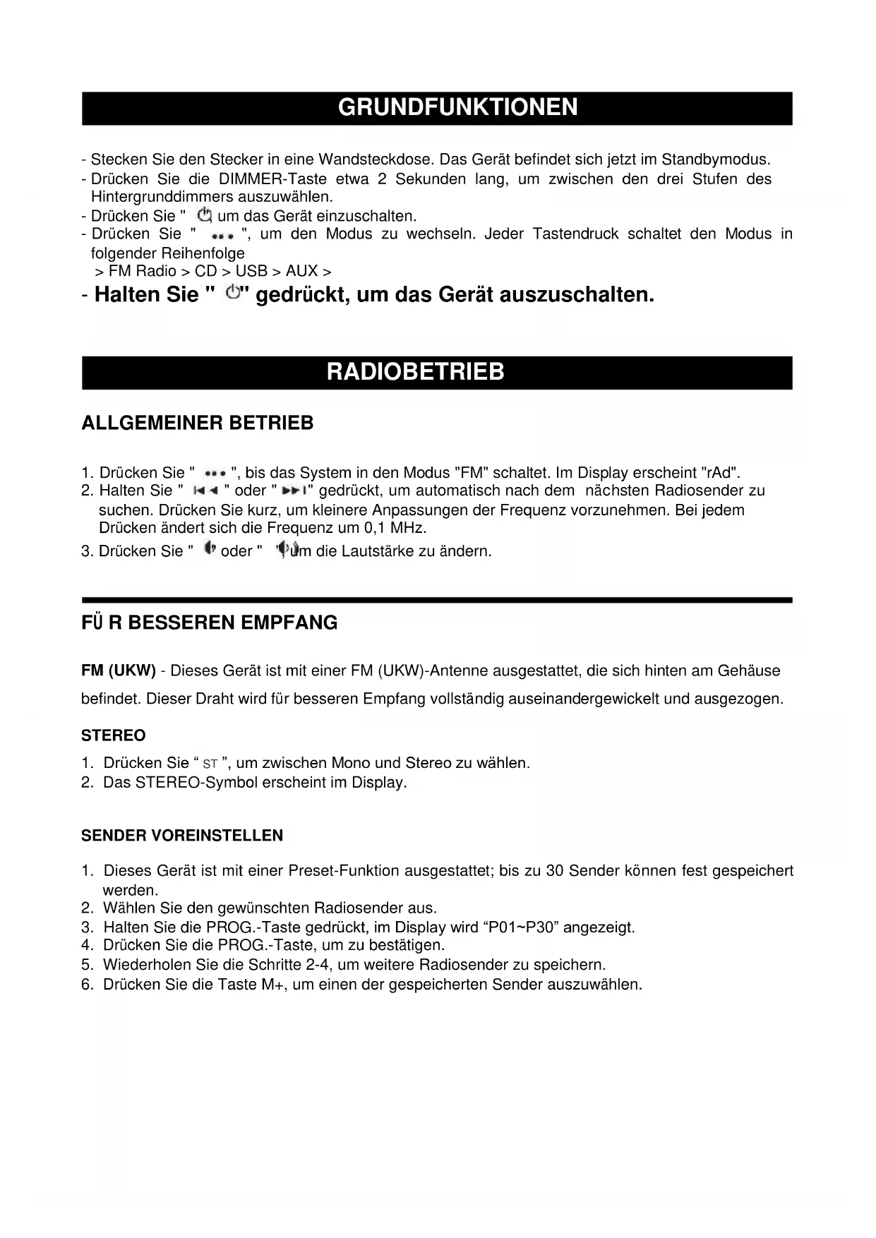 FM (UKW) - Dieses Gerät ist mit einer FM (UKW)-Antenne ausgestattet, die sich hinter am Gehäuse befindet. Diese Draht wird für betteren Empfang vollständig auseinandergewickelt und ausgezogen.