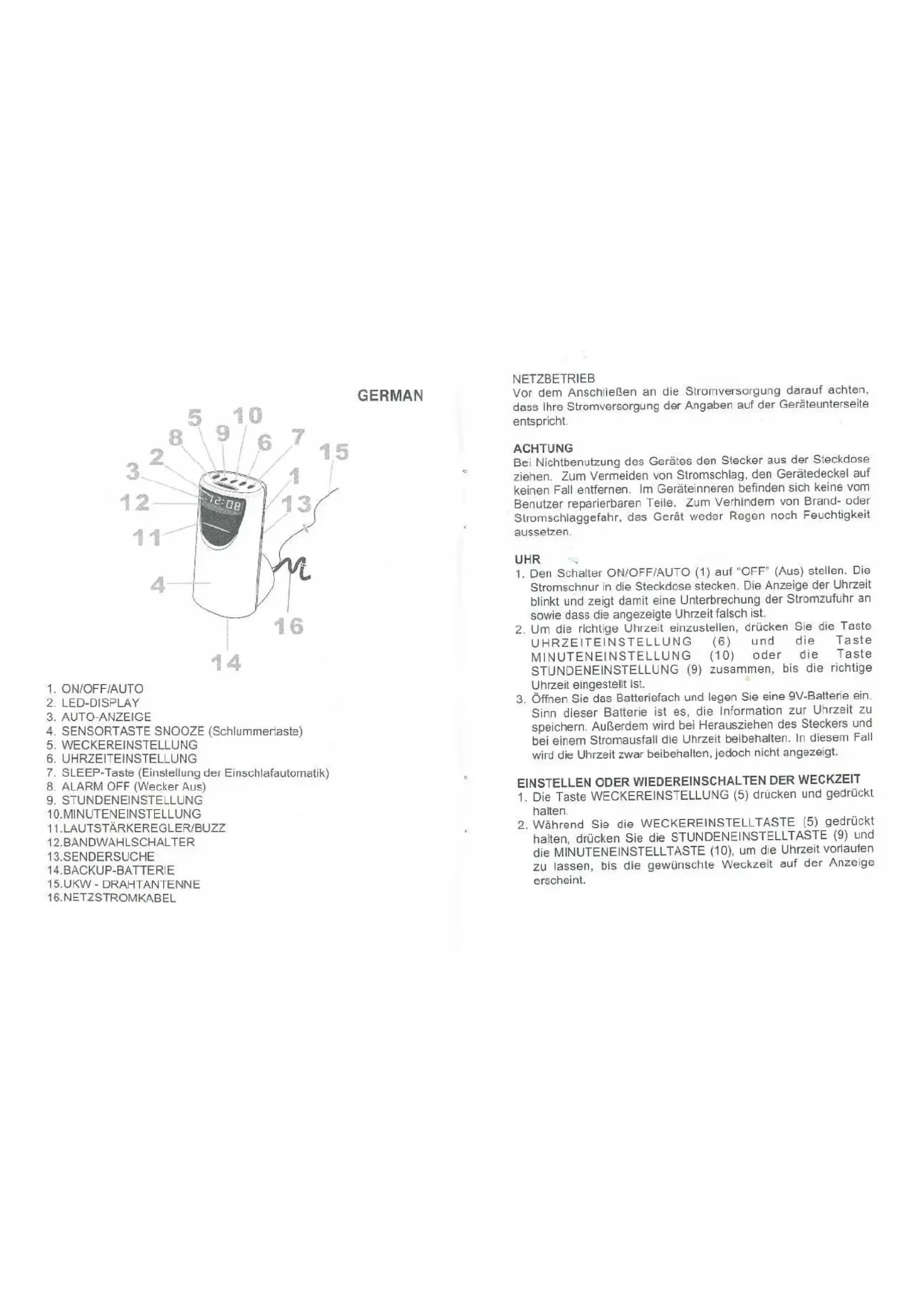 - Zum Ausschalten des Weckers, die Taste ALARM OFF (8) (Wecker aus) einmal drucken und die Weckzeit ist wieder für den nachsten Tag eingestellt. Schieben sie den Schalter ON/OFF/AUTO (1) auf die Position OFF, um den Wecker auszuschalten, damit er nicht am nachsten Tag wieder weckt.