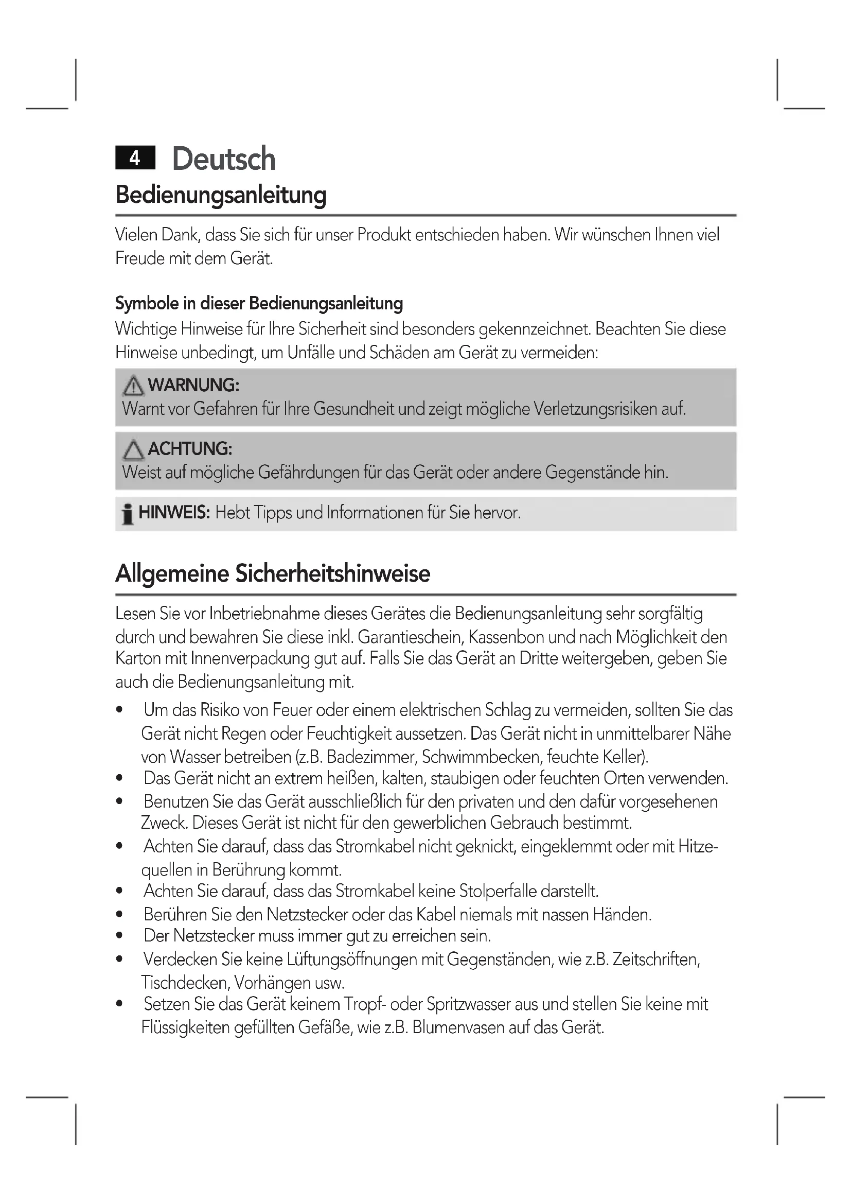 Bedienungsanleitung Vielen Dank, dass Sie sich für unser Produkt entschieden haben. Wir wünschen Ihnen viel Freude mit dem Gerät. Symbole in dieser Bedienungsanleitung Wichtige Hinweise für Ihre Sicherheit sind besonders gekennzeichnet. Beachten Sie diese Hinweise unbedingt, um Unfälle und Schäden am Gerät zu vermeiden: WARNUNG: Warnt vor Gefahren für Ihre Gesundheit und zeigt mögliche Verletzungsrisiken auf. ACHTUNG: Weist auf mögliche Gefährdungen für das Gerät oder andere Gegenstände hin. HINWEIS: Hebt Tipps und Informationen für Sie hervor. Allgemeine Sicherheitshinweise Lesen Sie vor Inbetriebnahme dieses Gerätes die Bedienungsanleitung sehr sorgfältig durch und bewahren Sie diese inkl. Garantieschein, Kassenbon und nach Möglichkeit den Karton mit Innenverpackung gut auf. Falls Sie das Gerät an Dritte weitergeben, geben Sie auch die Bedienungsanleitung mit.