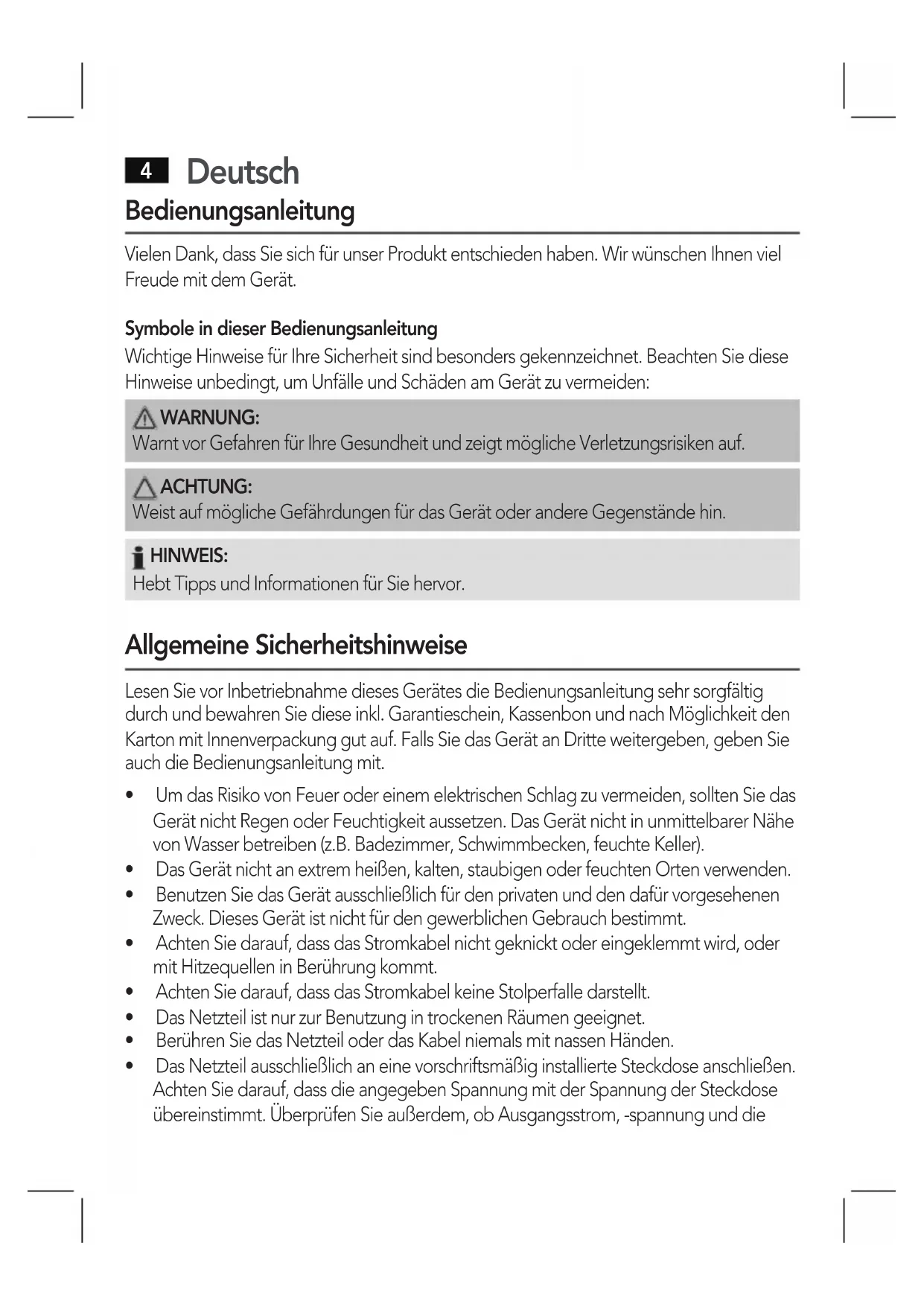 Bedienungsanleitung Vielen Dank, dass Sie sich für unser Produkt entschieden haben. Wir wünschen Ihnen viel Freude mit dem Gerät. Symbole in dieser Bedienungsanleitung Wichtige Hinweise für Ihre Sicherheit sind besonders gekennzeichnet. Beachten Sie diese Hinweise unbedingt, um Unfälle und Schäden am Gerät zu vermeiden: WARNUNG: Warnt vor Gefahren für Ihre Gesundheit und zeigt mögliche Verletzungsrisiken auf. ACHTUNG: Weist auf mögliche Gefährdungen für das Gerät oder andere Gegenstände hin. HINWEIS: Hebt Tipps und Informationen für Sie hervor. Allgemeine Sicherheitshinweise Lesen Sie vor Inbetriebnahme dieses Gerätes die Bedienungsanleitung sehr sorgfältig durch und bewahren Sie diese inkl. Garantieschein, Kassenbon und nach Möglichkeit den Karton mit Innenverpackung gut auf. Falls Sie das Gerät an Dritte weitergeben, geben Sie auch die Bedienungsanleitung mit.