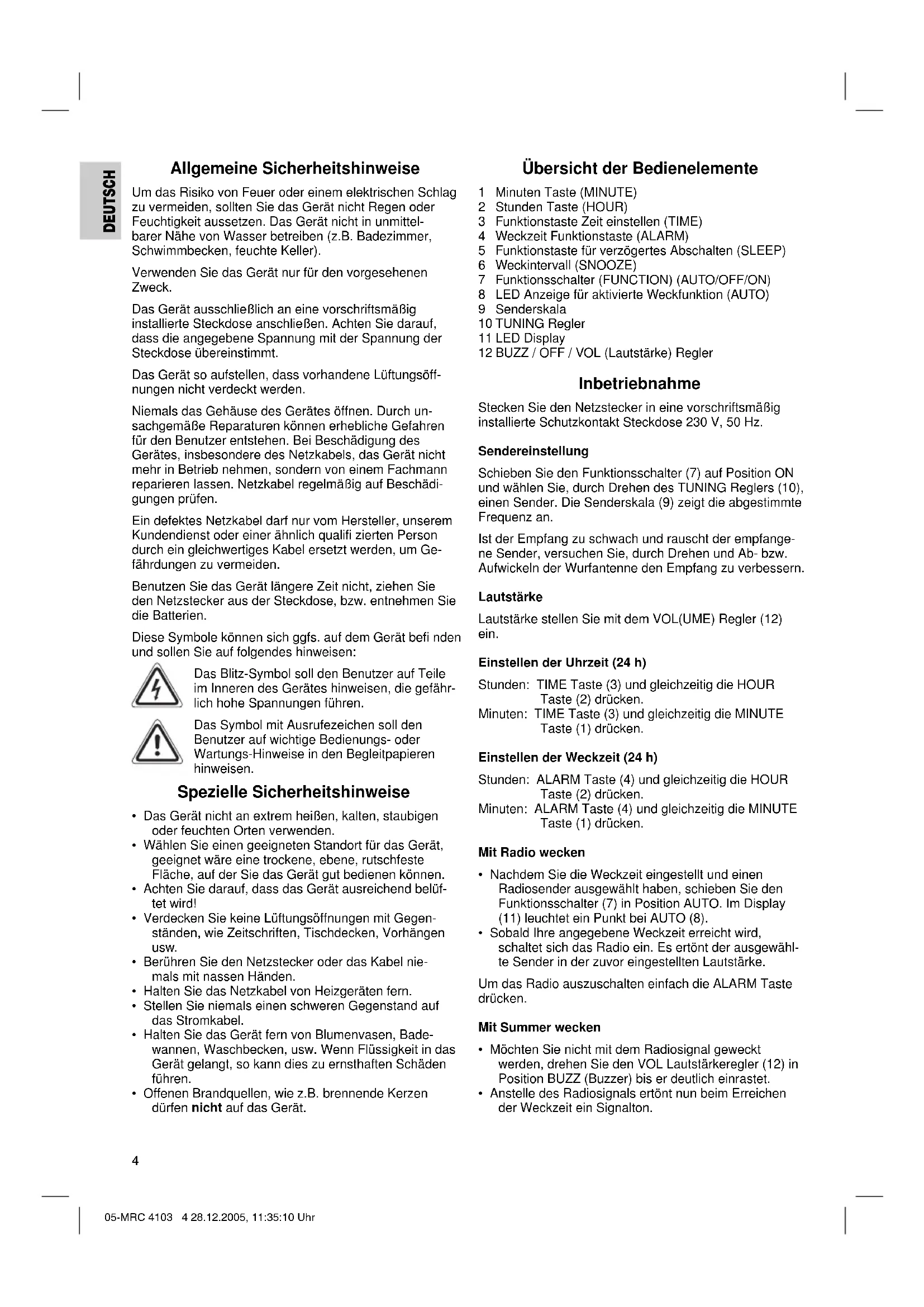 05-MRC 4103 2 28.12.2005, 11:35:09 Uhr3 Übersicht der Bedienelemente Overzicht van de bedieningselementen • Liste des différents éléments de commande Indicación de los elementos de manejo • Descrição dos elementos • Elementi di comando Oversikt over betjeningselementene • Overview of the Components Przegląd elementów obsługi • Přehled ovládacích prvků • A kezelő elemek áttekintése Обзор деталей прибора 05-MRC 4103 3 28.12.2005, 11:35:10 Uhr4 DEUTSCH Allgemeine Sicherheitshinweise Um das Risiko von Feuer oder einem elektrischen Schlag zu vermeiden, sollten Sie das Gerät nicht Regen oder Feuchtigkeit aussetzen. Das Gerät nicht in unmittel- barer Nähe von Wasser betreiben (z.B. Badezimmer, Schwimmbecken, feuchte Keller). Verwenden Sie das Gerät nur für den vorgesehenen Zweck. Das Gerät ausschließlich an eine vorschriftsmäßig installierte Steckdose anschließen. Achten Sie darauf, dass die angegebene Spannung mit der Spannung der Steckdose übereinstimmt. Das Gerät so aufstellen, dass vorhandene Lüftungsöff- nungen nicht verdeckt werden. Niemals das Gehäuse des Gerätes öffnen. Durch un- sachgemäße Reparaturen können erhebliche Gefahren für den Benutzer entstehen. Bei Beschädigung des Gerätes, insbesondere des Netzkabels, das Gerät nicht mehr in Betrieb nehmen, sondern von einem Fachmann reparieren lassen. Netzkabel regelmäßig auf Beschädi- gungen prüfen. Ein defektes Netzkabel darf nur vom Hersteller, unserem Kundendienst oder einer ähnlich qualifi zierten Person durch ein gleichwertiges Kabel ersetzt werden, um Ge- fährdungen zu vermeiden. Benutzen Sie das Gerät längere Zeit nicht, ziehen Sie den Netzstecker aus der Steckdose, bzw. entnehmen Sie die Batterien. Diese Symbole können sich ggfs. auf dem Gerät befi nden und sollen Sie auf folgendes hinweisen: Das Blitz-Symbol soll den Benutzer auf Teile im Inneren des Gerätes hinweisen, die gefähr- lich hohe Spannungen führen. Das Symbol mit Ausrufezeichen soll den Benutzer auf wichtige Bedienungs- oder Wartungs-Hinweise in den Begleitpapieren hinweisen. Spezielle Sicherheitshinweise