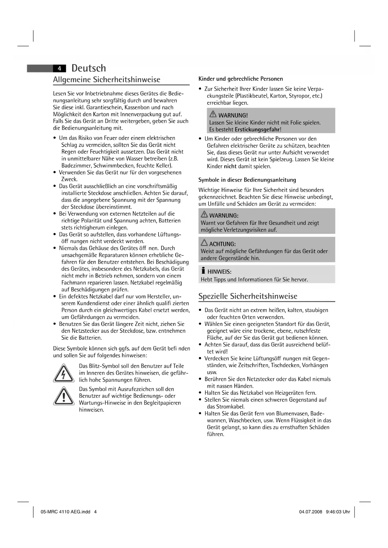- Halten Sie das Gerät fern von Blumenvasen, Bade- wannen, Waschbecken, usw. Wenn Flüssigkeit in das Gerät gelangt, so kann dies zu ernsthaften Schäden führen. 05-MRC 4110 AEG.indd 405-MRC 4110 AEG.indd 4 04.07.2008 9:46:03 Uhr04.07.2008 9:46:03 UhrDeutsch