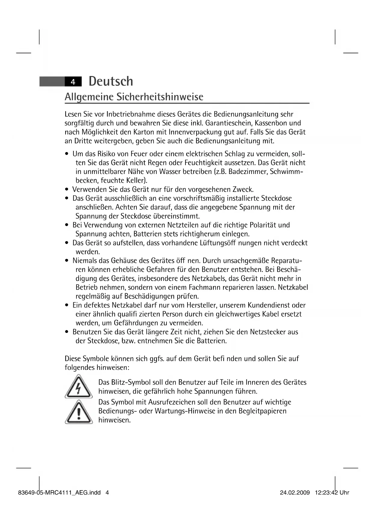 - Benutzen Sie das Gerät längere Zeit nicht, ziehen Sie den Netzstecker aus der Steckdose, bzw. entnehmen Sie die Batterien. Diese Symbole können sich ggfs. auf dem Gerät be nden und sollen Sie auf folgendes hinweisen: Das Blitz-Symbol soll den Benutzer auf Teile im Inneren des Gerätes hinweisen, die gefährlich hohe Spannungen führen. Das Symbol mit Ausrufezeichen soll den Benutzer auf wichtige Bedienungs- oder Wartungs-Hinweise in den Begleitpapieren hinweisen. 83649-05-MRC4111_AEG.indd 483649-05-MRC4111_AEG.indd 4 24.02.2009 12:23:42 Uhr24.02.2009 12:23:42 UhrDeutsch