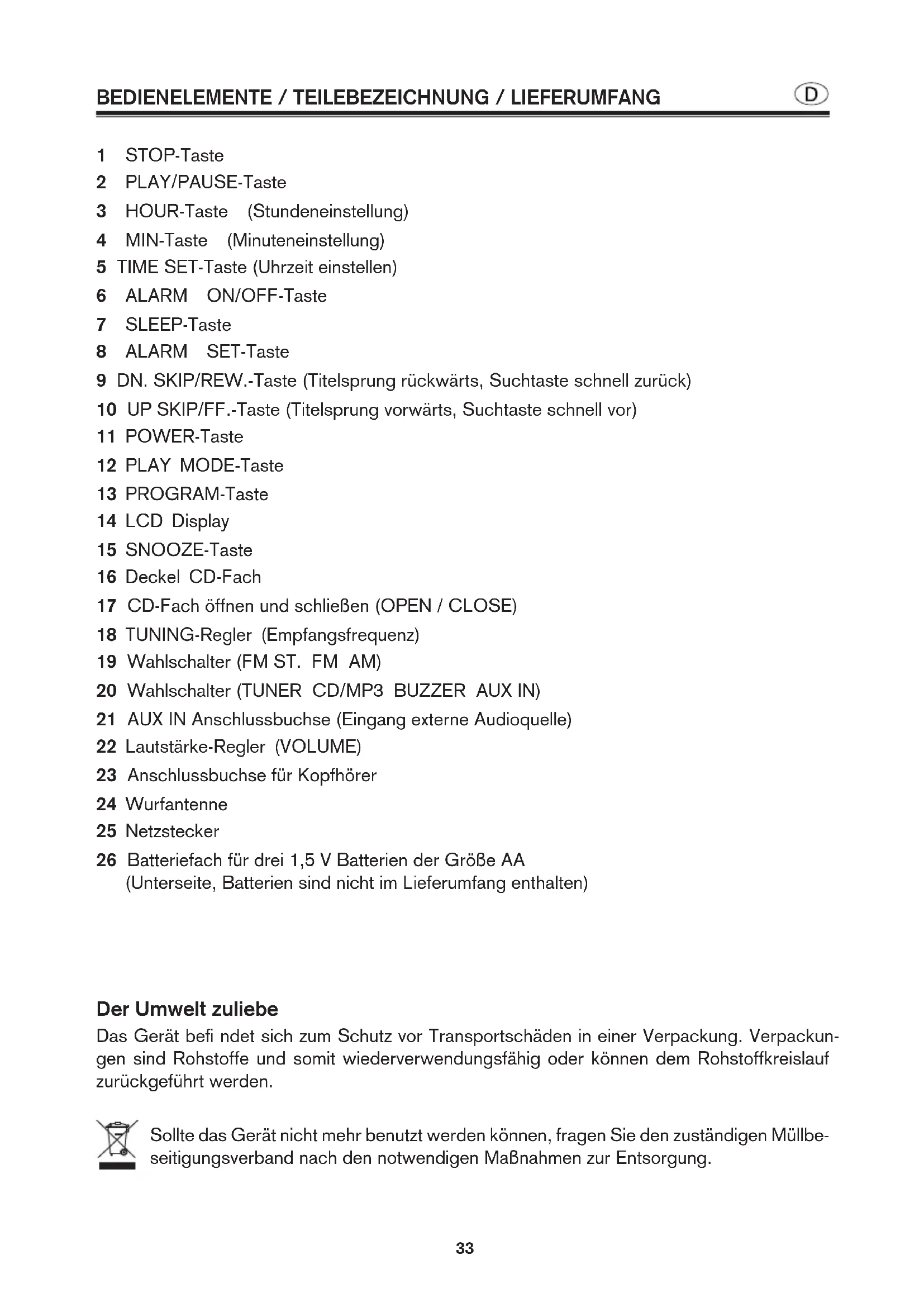 1 STOP-Taste 2 PLAY/PAUSE-Taste 3 HOUR-Taste (Stundeneinstellung) 4 MIN-Taste (Minuteneinstellung) 5 TIME SET-Taste (Uhrzeit einstellen) 6 ALARM ON/OFF-Taste 7 SLEEP-Taste 8 ALARM SET-Taste 9 DN. SKIP/REW.-Taste (Titelsprung rückwärts, Suchtaste schnell zurück) 10 UP SKIP/FF.-Taste (Titelsprung vorwärts, Suchtaste schnell vor) 11 POWER-Taste 12 PLAY MODE-Taste 13 PROGRAM-Taste 14 LCD Display 15 SNOOZE-Taste 16 Deckel CD-Fach 17 CD-Fach öffnen und schließen (OPEN / CLOSE) 18 TUNING-Regler (Empfangsfrequenz) 19 Wahlschalter (FM ST. FM AM) 20 Wahlschalter (TUNER CD/MP3 BUZZER AUX IN) 21 AUX IN Anschlussbuchse (Eingang externe Audioquelle) 22 Lautstärke-Regler (VOLUME) 23 Anschlussbuchse für Kopfhörer 24 Wurfantenne 25 Netzstecker 26 Batteriefach für drei 1,5 V Batterien der Größe AA (Unterseite, Batterien sind nicht im Lieferumfang enthalten) Der Umwelt zuliebe Das Gerät befi ndet sich zum Schutz vor Transportschäden in einer Verpackung. Verpackun- gen sind Rohstoffe und somit wiederverwendungsfähig oder können dem Rohstoffkreislauf zurückgeführt werden. Sollte das Gerät nicht mehr benutzt werden können, fragen Sie den zuständigen Müllbe- seitigungsverband nach den notwendigen Maßnahmen zur Entsorgung. MAGNUM CDR 209 (D).indd 33MAGNUM CDR 209 (D).indd 33 19.09.2005 14:25:07 Uhr19.09.2005 14:25:07 Uhr34