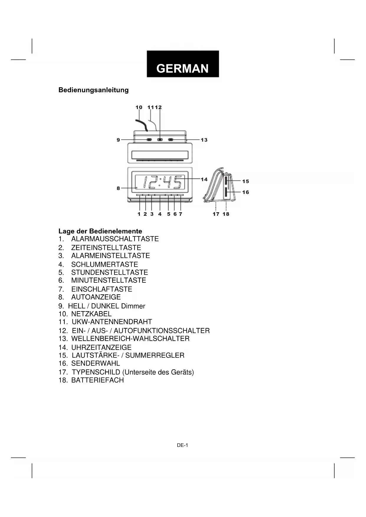 AUS- / AUTOFUNKTIONSSCHALTER (12) zur Position “AUTO“. RADIO: Wecken mit Radio das Radio muss auf einen Sender abgestimmt sein, der zur Alarmzeit sendet, und die Lautstärke muss wie gewünscht eingestellt sein. ALARM: Für Aufwecken durch den Summer, den Lautstärkeregler auf die minimale Position BUZZ stellen.DE-3 Unterbrechen des Alarms (Schlummerfunktion) Der Alarm kann durch Drücken der SCHLUMMERTASTE (4) für 9 Minuten unterbrochen werden, und dann ertönt das Radio oder der Summer wieder. Abstellen des Alarms Drücken Sie zum Abstellen des Alarms die ALARMAUSSCHALTTASTE (1) einmal. Hierdurch wird die Alarmzeit für den nächsten Tag zurückgestellt. Schieben Sie den EIN- / AUS- / AUTOFUNKTIONSSCHALTER (12) auf “OFF“, um den Alarm abzustellen und stellen Sie ihn dann für den nächsten Tag. Einschlaf-Zeitschalter-Betrieb