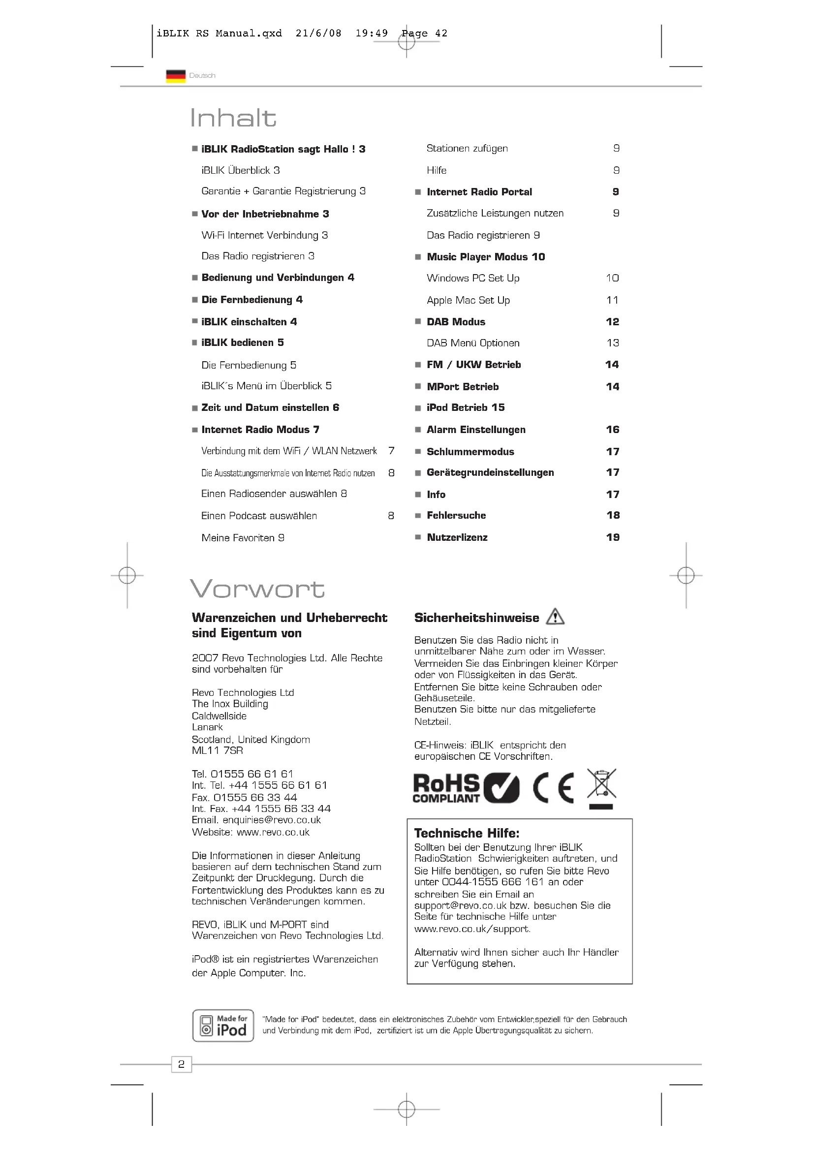 Sollten bei der Benutzung ihrer iBLIK RadioStation Schwierigkeiten aufreten, und Sie Hilfe benotigen, so rufen Sieitte Revo unter 0044-1555 666 161 an oder schreiben Sie ein Email an support@revo.co.uk bzw. besuchen Sie die Seite fur technische Hilfe unter www.revo.co.uk/support.