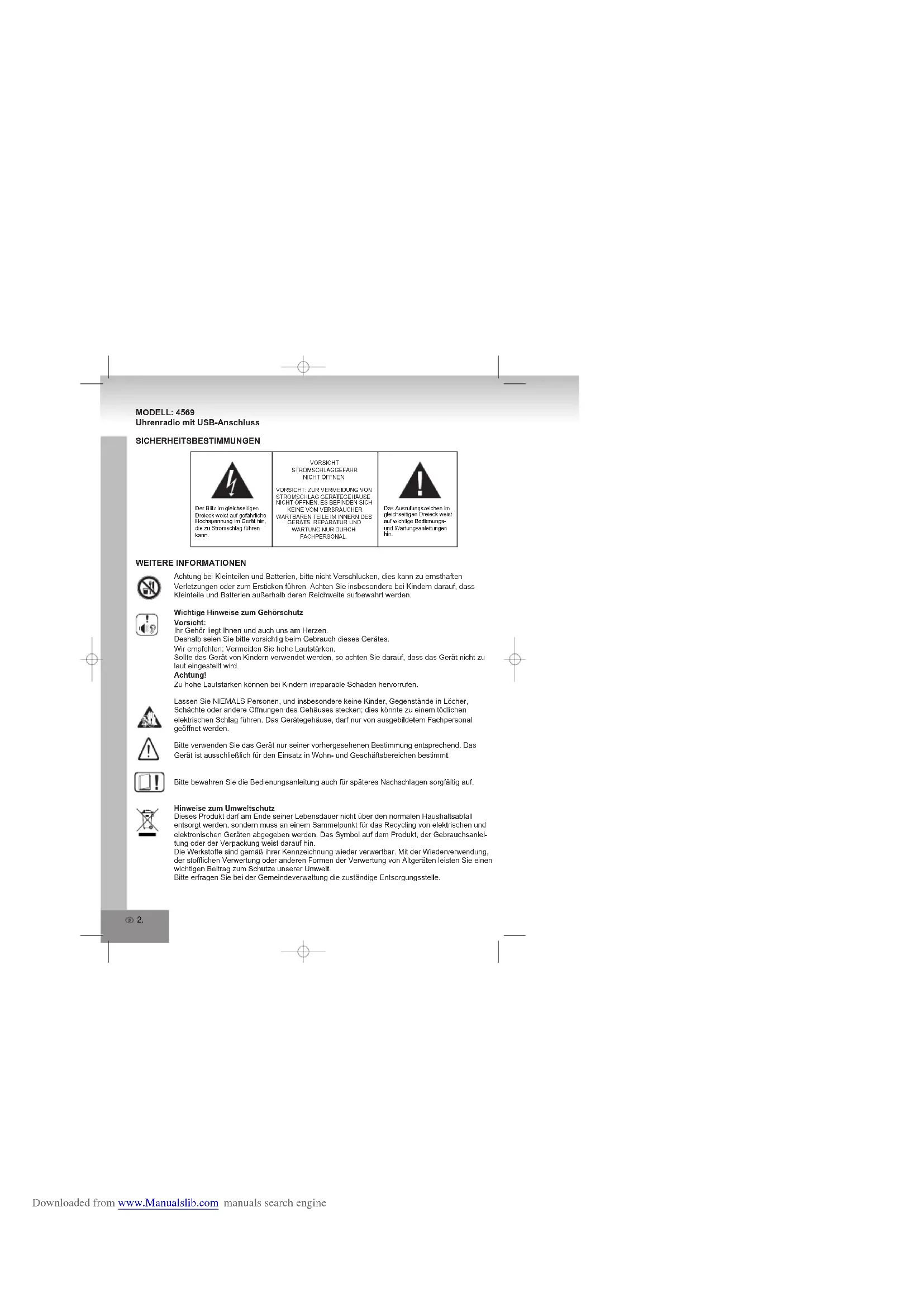Downloaded from www.Manualslib.com manuals search engine2. MODELL: 4569 Uhrenradio mit USB-Anschluss SICHERHEITSBESTIMMUNGEN Das Ausrufungszeichen im gleichseitigen Dreieck weist auf wichtige Bedienungs- und Wartungsanleitungen hin. Der Blitz im gleichseitigen Dreieck weist auf gefährliche Hochspannung im Gerät hin, die zu Stromschlag führen kann.Achtung bei Kleinteilen und Batterien, bitte nicht Verschlucken, dies kann zu ernsthaften Verletzungen oder zum Ersticken führen. Achten Sie insbesondere bei Kindern darauf, dass Kleinteile und Batterien außerhalb deren Reichweite aufbewahrt werden.Wichtige Hinweise zum GehörschutzVorsicht:Ihr Gehör liegt Ihnen und auch uns am Herzen.Deshalb seien Sie bitte vorsichtig beim Gebrauch dieses Gerätes.Wir empfehlen: Vermeiden Sie hohe Lautstärken.Sollte das Gerät von Kindern verwendet werden, so achten Sie darauf, dass das Gerät nicht zu laut eingestellt wird.Achtung!Zu hohe Lautstärken können bei Kindern irreparable Schäden hervorrufen.Lassen Sie NIEMALS Personen, und insbesondere keine Kinder, Gegenstände in Löcher, Schächte oder andere Öffnungen des Gehäuses stecken; dies könnte zu einem tödlichen elektrischen Schlag führen. Das Gerätegehäuse, darf nur von ausgebildetem Fachpersonal geöffnet werden.Bitte verwenden Sie das Gerät nur seiner vorhergesehenen Bestimmung entsprechend. Das Gerät ist ausschließlich für den Einsatz in Wohn- und Geschäftsbereichen bestimmt.Bitte bewahren Sie die Bedienungsanleitung auch für späteres Nachschlagen sorgfältig auf.Hinweise zum UmweltschutzDieses Produkt darf am Ende seiner Lebensdauer nicht über den normalen Haushaltsabfall entsorgt werden, sondern muss an einem Sammelpunkt für das Recycling von elektrischen und elektronischen Geräten abgegeben werden. Das Symbol auf dem Produkt, der Gebrauchsanlei tung oder der Verpackung weist darauf hin.Die Werkstoffe sind gemäß ihrer Kennzeichnung wieder verwertbar. Mit der Wiederverwendung, der stofflichen Verwertung oder anderen Formen der Verwertung von Altgeräten leisten Sie einen wichtigen Beitrag zum Schutze unserer Umwelt.Bitte erfragen Sie bei der Gemeindeverwaltung die zuständige Entsorgungsstelle. WEITERE INFORMATIONEN VORSICHT STROMSCHLAGGEFAHRNICHT ÖFFNENVORSICHT: ZUR VERMEIDUNG VON STROMSCHLAG GERÄTEGEHÄUSE NICHT ÖFFNEN. ES BEFINDEN SICH KEINE VOM VERBRAUCHER WARTBAREN TEILE IM INNERN DES GERÄTS. REPARATUR UND WARTUNG NUR DURCH FACHPERSONAL. Downloaded from www.Manualslib.com manuals search engine3. Behindern Sie nicht die Belüftung des Gerätes, wie etwa mit Vorhängen, Zeitungen, Decken oder mit Möbelstücken, die Belüftungsschlitze müssen immer frei sein. Überhitzung kann Schäden verursachen und die Lebensdauer des Gerätes verkürzen.Hitze und WärmeSetzen Sie das Gerät nicht direkter Sonnenstrahlung aus. Achten Sie darauf, dass das Gerät keinen direkten Wärmequellen wie Heizung oder offenem Feuer ausgesetzt ist. Achten Sie darauf, dass die Lüftungsschlitze des Gerätes nicht verdeckt sind.Feuchtigkeit und ReinigungDieses Produkt ist nicht wasserfest! Tauchen Sie das Gerät nicht in Wasser ein und lassen es auch nicht mit Wasser in Berührung kommen. In das Gerät eindringendes Wasser kann ernsthafte Schäden verursachen.Verwenden Sie keine Reinigungsmittel, die Alkohol, Ammoniak, Benzin oder Schleifmittel enthalten, da diese das Gerät beschädigen können. Verwenden Sie zum Reinigen ein weiches, leicht angefeuchtetes Tuch.Batterien fachgerecht entsorgenBatterien gehören nicht in den Hausmüll. Die Batterien müssen bei einer Sammelstelle für Altbatterien abgegeben werden. Werfen Sie Batterien niemals in Feuer. SICHERHEITSHINWEISE