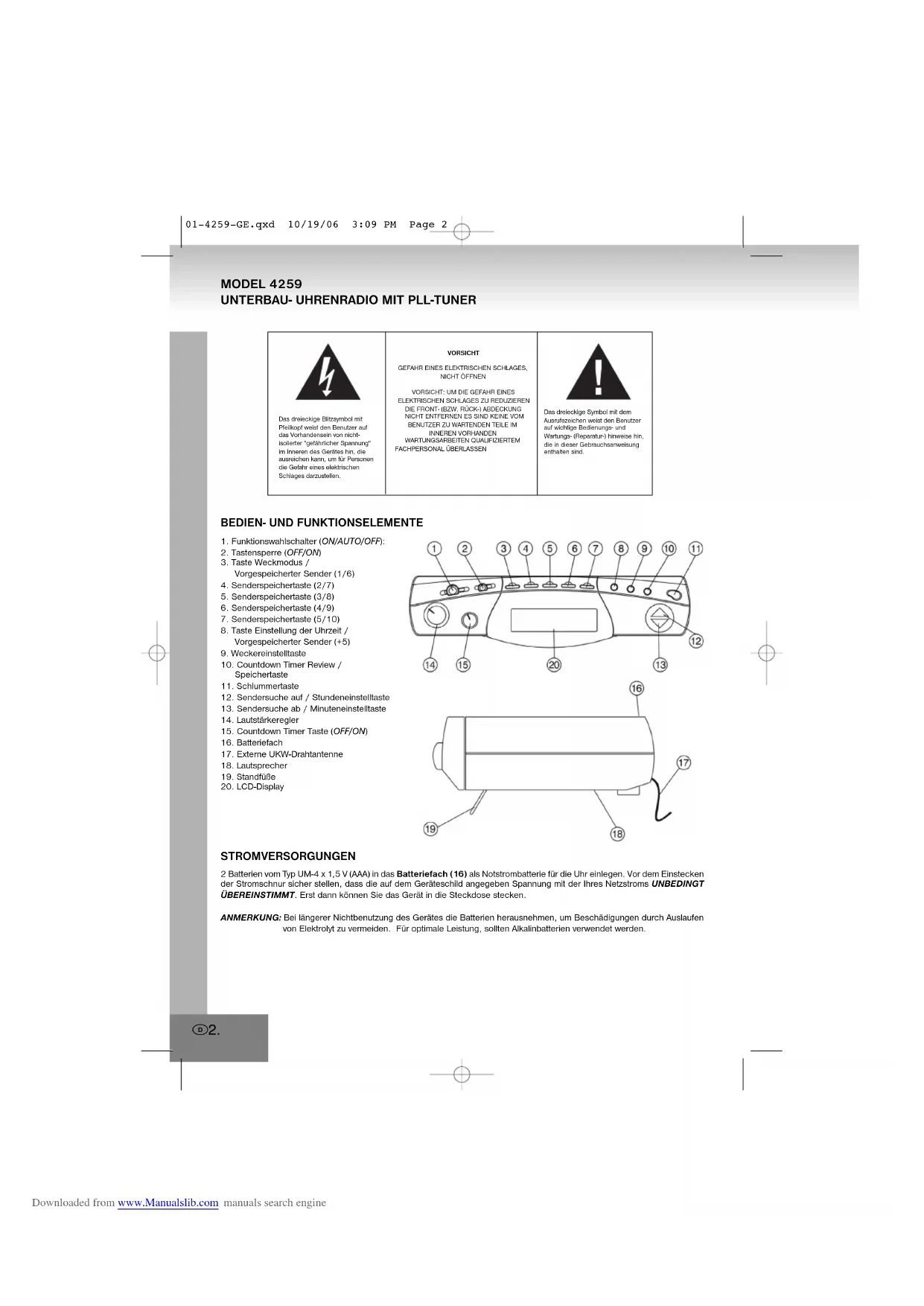 SINTONIZADOR PLL 00-4259 Cover 10/19/06 3:08 PM Page 3 Downloaded from www.Manualslib.com manuals search engineBEDIEN- UND FUNKTIONSELEMENTE 1. Funktionswahlschalter (ON/AUTO/OFF):2. Tastensperre (OFF/ON)3. Taste Weckmodus / Vorgespeicherter Sender (1/6)4. Senderspeichertaste (2/7)5. Senderspeichertaste (3/8)6. Senderspeichertaste (4/9)7. Senderspeichertaste (5/10)8. Taste Einstellung der Uhrzeit / Vorgespeicherter Sender (+5)9. Weckereinstelltaste10. Countdown Timer Review / Speichertaste11. Schlummertaste12. Sendersuche auf / Stundeneinstelltaste13. Sendersuche ab / Minuteneinstelltaste14. Lautstärkeregler15. Countdown Timer Taste (OFF/ON)16. Batteriefach17. Externe UKW-Drahtantenne18. Lautsprecher19. Standfüße20. LCD-Display STROMVERSORGUNGEN 2 Batterien vom Typ UM-4 x 1,5 V (AAA) in das Batteriefach (16) als Notstrombatterie für die Uhr einlegen. Vor dem Einstecken der Stromschnur sicher stellen, dass die auf dem Geräteschild angegeben Spannung mit der Ihres Netzstroms UNBEDINGT ÜBEREINSTIMMT. Erst dann können Sie das Gerät in die Steckdose stecken. ANMERKUNG: Bei längerer Nichtbenutzung des Gerätes die Batterien herausnehmen, um Beschädigungen durch Auslaufen von Elektrolyt zu vermeiden. Für optimale Leistung, sollten Alkalinbatterien verwendet werden. D 2. MODEL 4259
