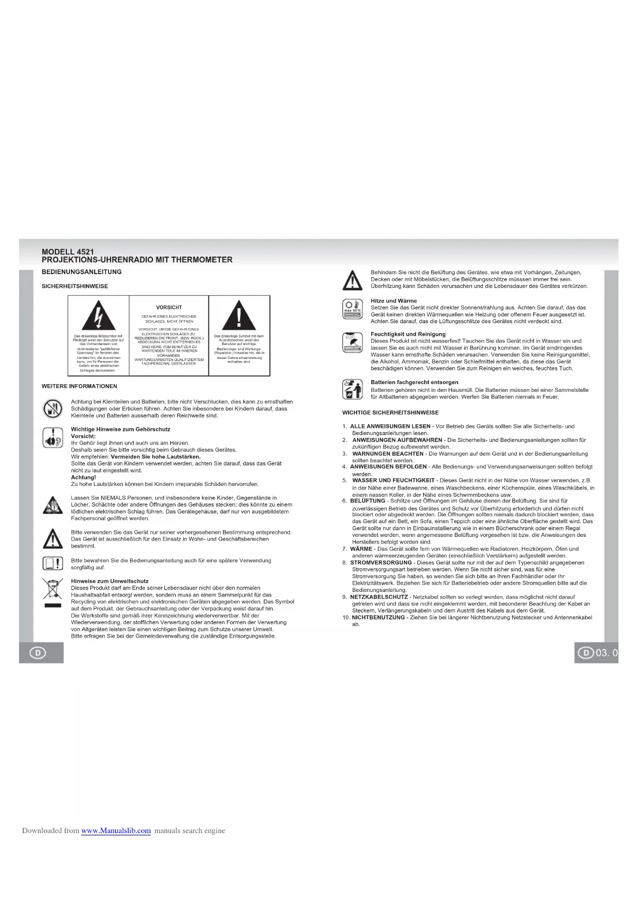 in der Nähe einer Badewanne, eines Waschbeckens, einer Küchenspüle, eines Waschkübels, in einem nassen Keller, in der Nähe eines Schwimmbeckens usw.6. BELÜFTUNG - Schlitze und Öffnungen im Gehäuse dienen der Belüftung. Sie sind für zuverlässigen Betrieb des Gerätes und Schutz vor Überhitzung erforderlich und dürfen nicht blockiert oder abgedeckt werden. Die Öffnungen sollten niemals dadurch blockiert werden, dass das Gerät auf ein Bett, ein Sofa, einen Teppich oder eine ähnliche Oberfläche gestellt wird. Das Gerät sollte nur dann in Einbauinstallierung wie in einem Bücherschrank oder einem Regal verwendet werden, wenn angemessene Belüftung vorgesehen ist bzw. die Anweisungen des Herstellers befolgt worden sind.7. WÄRME - Das Gerät sollte fern von Wärmequellen wie Radiatoren, Heizkörpern, Öfen und anderen wärmeerzeugenden Geräten (einschließlich Verstärkern) aufgestellt werden.8. STROMVERSORGUNG - Dieses Gerät sollte nur mit der auf dem Typenschild angegebenen Stromversorgungsart betrieben werden. Wenn Sie nicht sicher sind, was für eine Stromversorgung Sie haben, so wenden Sie sich bitte an Ihren Fachhändler oder Ihr Elektrizitätswerk. Beziehen Sie sich für Batteriebetrieb oder andere Stromquellen bitte auf die Bedienungsanleitung.9. NETZKABELSCHUTZ - Netzkabel sollten so verlegt werden, dass möglichst nicht darauf getreten wird und dass sie nicht eingeklemmt werden, mit besonderer Beachtung der Kabel an Steckern, Verlängerungskabeln und dem Austritt des Kabels aus dem Gerät.10. NICHTBENUTZUNG - Ziehen Sie bei längerer Nichtbenutzung Netzstecker und Antennenkabel ab. Behindern Sie nicht die Belüftung des Gerätes, wie etwa mit Vorhängen, Zeitungen, Decken oder mit Möbelstücken, die Belüftungsschlitze müsssen immer frei sein. Überhitzung kann Schäden verursachen und die Lebensdauer des Gerätes verkürzen.Hitze und WärmeSetzen Sie das Gerät nicht direkter Sonnenstrahlung aus. Achten Sie darauf, das das Gerät keinen direkten Wärmequellen wie Heizung oder offenem Feuer ausgesetzt ist. Achten Sie darauf, das die Lüftungsschlitze des Gerätes nicht verdeckt sind.Feuchtigkeit und ReinigungDieses Produkt ist nicht wasserfest! Tauchen Sie das Gerät nicht in Wasser ein und lassen Sie es auch nicht mit Wasser in Berührung kommen. Im Gerät eindringendes Wasser kann ernsthafte Schäden verursachen. Verwenden Sie keine Reinigungsmittel, die Alkohol, Ammoniak, Benzin oder Schleifmittel enthalten, da diese das Gerät beschädigen können. Verwenden Sie zum Reinigen ein weiches, feuchtes Tuch.Batterien fachgerecht entsorgenBatterien gehören nicht in den Hausmüll. Die Batterien müssen bei einer Sammelstelle für Altbatterien abgegeben werden. Werfen Sie Batterien niemals in Feuer. Downloaded from www.Manualslib.com manuals search engine05. 04.