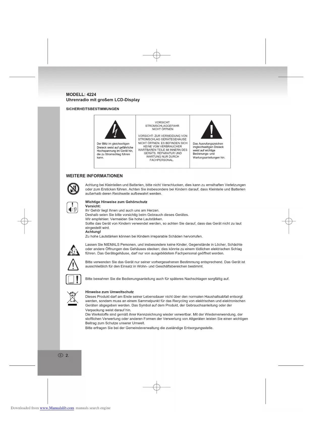 Downloaded from www.Manualslib.com manuals search engine2. MODELL: 4224 Uhrenradio mit großem LCD-Display SICHERHEITSBESTIMMUNGENDas Ausrufungszeichen imgleichseitigen Dreieck weist auf wichtige Bedienungs- und Wartungsanleitungen hin.Der Blitz im gleichseitigen Dreieck weist auf gefährliche Hochspannung im Gerät hin, die zu Stromschlag führen kann.Achtung bei Kleinteilen und Batterien, bitte nicht Verschlucken, dies kann zu ernsthaften Verletzungen oder zum Ersticken führen. Achten Sie insbesondere bei Kindern darauf, dass Kleinteile und Batterien außerhalb deren Reichweite aufbewahrt werden.Wichtige Hinweise zum GehörschutzVorsicht:Ihr Gehör liegt Ihnen und auch uns am Herzen.Deshalb seien Sie bitte vorsichtig beim Gebrauch dieses Gerätes.Wir empfehlen: Vermeiden Sie hohe Lautstärken.Sollte das Gerät von Kindern verwendet werden, so achten Sie darauf, dass das Gerät nicht zu laut eingestellt wird.Achtung!Zu hohe Lautstärken können bei Kindern irreparable Schäden hervorrufen.Lassen Sie NIEMALS Personen, und insbesondere keine Kinder, Gegenstände in Löcher, Schächte oder andere Öffnungen des Gehäuses stecken; dies könnte zu einem tödlichen elektrischen Schlag führen. Das Gerätegehäuse, darf nur von ausgebildetem Fachpersonal geöffnet werden.Bitte verwenden Sie das Gerät nur seiner vorhergesehenen Bestimmung entsprechend. Das Gerät ist ausschließlich für den Einsatz in Wohn- und Geschäftsbereichen bestimmt.Bitte bewahren Sie die Bedienungsanleitung auch für späteres Nachschlagen sorgfältig auf.Hinweise zum UmweltschutzDieses Produkt darf am Ende seiner Lebensdauer nicht über den normalen Haushaltsabfall entsorgt werden, sondern muss an einem Sammelpunkt für das Recycling von elektrischen und elektronischen Geräten abgegeben werden. Das Symbol auf dem Produkt, der Gebrauchsanleitung oder der Verpackung weist darauf hin.Die Werkstoffe sind gemäß ihrer Kennzeichnung wieder verwertbar. Mit der Wiederverwendung, der stofflichen Verwertung oder anderen Formen der Verwertung von Altgeräten leisten Sie einen wichtigen Beitrag zum Schutze unserer Umwelt.Bitte erfragen Sie bei der Gemeindeverwaltung die zuständige Entsorgungsstelle. WEITERE INFORMATIONEN VORSICHTSTROMSCHLAGGEFAHRNICHT ÖFFNENVORSICHT: ZUR VERMEIDUNG VON STROMSCHLAG GERÄTEGEHÄUSE NICHT ÖFFNEN. ES BEFINDEN SICH KEINE VOM VERBRAUCHER WARTBAREN TEILE IM INNERN DES GERÄTS. REPARATUR UND WARTUNG NUR DURCH FACHPERSONAL. Downloaded from www.Manualslib.com manuals search engine3. Behindern Sie nicht die Belüftung des Gerätes, wie etwa mit Vorhängen, Zeitungen, Decken oder mit Möbelstücken, die Belüftungsschlitze müssen immer frei sein. Überhitzung kann Schäden verursachen und die Lebensdauer des Gerätes verkürzen.Hitze und WärmeSetzen Sie das Gerät nicht direkter Sonnenstrahlung aus. Achten Sie darauf, dass das Gerät keinen direkten Wärmequellen wie Heizung oder offenem Feuer ausgesetzt ist. Achten Sie darauf, dass die Lüftungsschlitze des Gerätes nicht verdeckt sind.Feuchtigkeit und ReinigungDieses Produkt ist nicht wasserfest! Tauchen Sie das Gerät nicht in Wasser ein und lassen es auch nicht mit Wasser in Berührung kommen. In das Gerät eindringendes Wasser kann ernsthafte Schäden verursachen.Verwenden Sie keine Reinigungsmittel, die Alkohol, Ammoniak, Benzin oder Schleifmittel enthalten, da diese das Gerät beschädigen können. Verwenden Sie zum Reinigen ein weiches, leicht angefeuchtetes Tuch.Batterien fachgerecht entsorgenBatterien gehören nicht in den Hausmüll. Die Batterien müssen bei einer Sammelstelle für Altbatterien abgegeben werden. Werfen Sie Batterien niemals in Feuer. SICHERHEITSHINWEISE