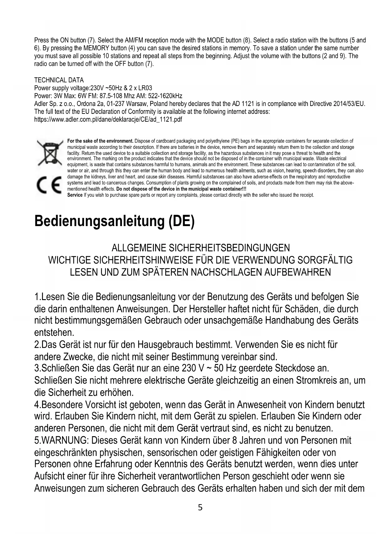 Drücken Sie auf die Taste ON (7). Wählen Sie den AM/FM-Empfangsmodus mit der Taste MODE (8). Wählen Sie einen Radiosender mit den Tasten (5 und 6). Durch Drücken der Taste MEMORY (4) können Sie die gewünschten Sender speichern. Um einen Sender unter der gleichen Nummer zu speichern, müssen Sie alle möglichen 10 Sender speichern und alle Schritte von Anfang an wiederholen. Stellen Sie die Lautstärke mit den Tasten (2 und 9) ein. Das Radio kann mit der Taste OFF (7) ausgeschaltet werden. TECHNISCHE DATEN Versorgungsspannung: 230V ~50Hz & 2 x LR03 Leistung: 3W Max: 6W FM: 87,5-108 Mhz AM: 522-1620kHz Adler Sp. z o.o., Ordona 2a, 01-237 Warschau, Polen erklärt hiermit, dass das AD 1121 mit der Richtlinie 2014/53/EU übereinstimmt. Der vollständige Text der EU-Konformitätserklärung ist unter der folgenden Internetadresse abrufbar: https://www.adler.com.pl/dane/deklaracje/CE/ad_1121.pdf8