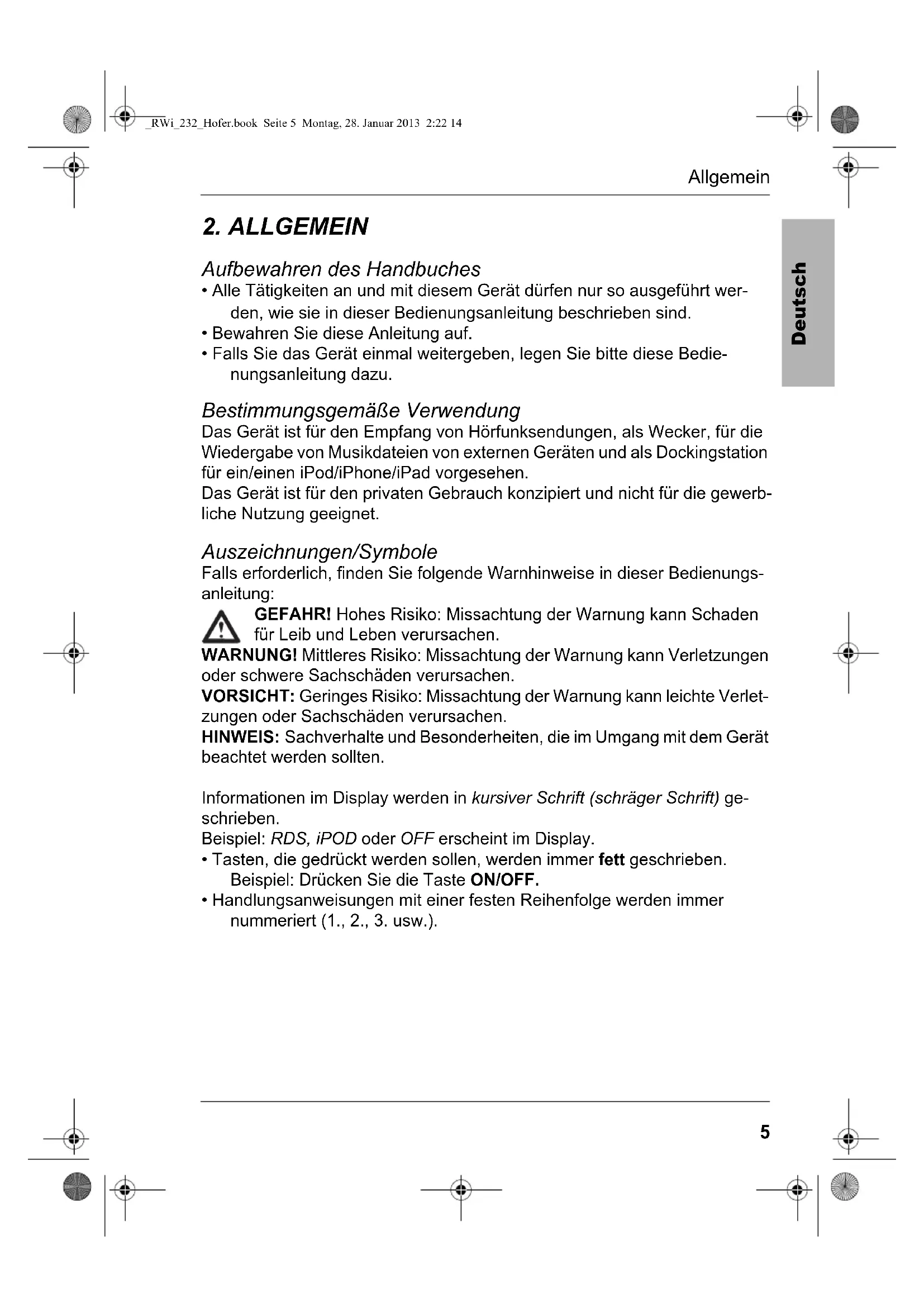 - ^di Weckradio mit Dockingstation für iPod / iPhone / iPad Radio-réveil avec station d’accueil pour iPod / iPhone / iPad Radiosveglia con docking station per iPod/iPhone/iPad Radio ura s priklopno postajo za iPod/iPhone/iPad Bedienungsanleitung Mode d’emploi / Manuale di istruzioni / Navodilo za uporabo Aktionszeitraum: 06/2013, Modell: RWi 232Originalbedienungsanleitung Deutsch p. 2