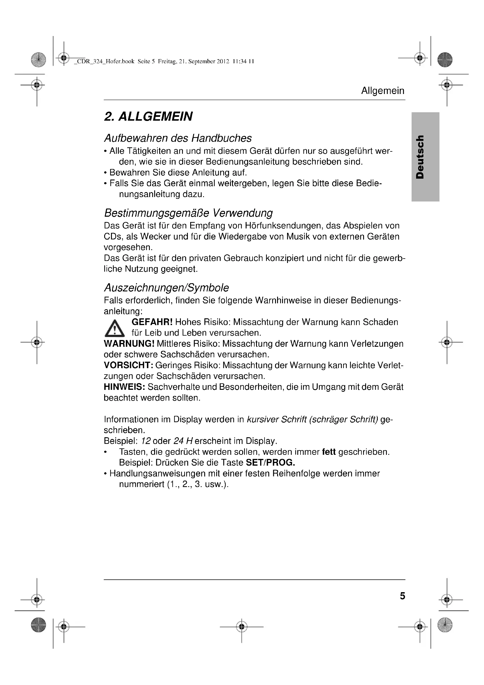 - Handlungsanweisungen mit einer festen Reihenfolge werden immer nummeriert (1., 2., 3. usw.). _CDR_324_Hofer.book Seite 5 Freitag, 21. September 2012 11:34 116 Sicherheitshinweise