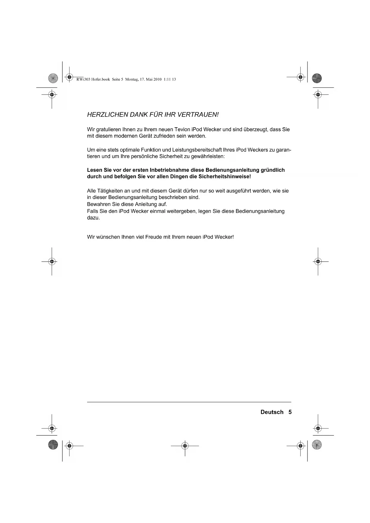 RWi303 Hofer.book Seite 4 Montag, 17. Mai 2010 1:11 13Deutsch 5 HERZLICHEN DANK FÜR IHR VERTRAUEN! Wir gratulieren Ihnen zu Ihrem neuen Tevion iPod Wecker und sind überzeugt, dass Sie mit diesem modernen Gerät zufrieden sein werden. Um eine stets optimale Funktion und Leistungsbereitschaft Ihres iPod Weckers zu garan- tieren und um Ihre persönliche Sicherheit zu gewährleisten: Lesen Sie vor der ersten Inbetriebnahme diese Bedienungsanleitung gründlich durch und befolgen Sie vor allen Dingen die Sicherheitshinweise! Alle Tätigkeiten an und mit diesem Gerät dürfen nur so weit ausgeführt werden, wie sie in dieser Bedienungsanleitung beschrieben sind. Bewahren Sie diese Anleitung auf. Falls Sie den iPod Wecker einmal weitergeben, legen Sie diese Bedienungsanleitung dazu. Wir wünschen Ihnen viel Freude mit Ihrem neuen iPod Wecker! RWi303 Hofer.book Seite 5 Montag, 17. Mai 2010 1:11 136 Deutsch