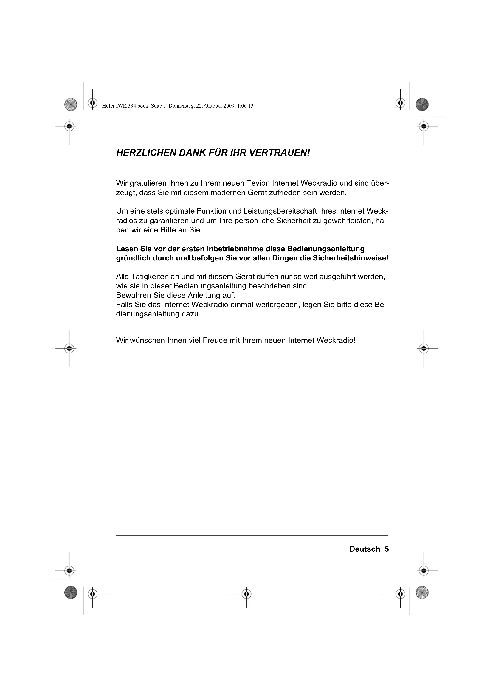 Hofer IWR 394.book Seite 4 Donnerstag, 22. Oktober 2009 1:06 13Deutsch 5 HERZLICHEN DANK FÜR IHR VERTRAUEN! Wir gratulieren Ihnen zu Ihrem neuen Tevion Internet Weckradio und sind über- zeugt, dass Sie mit diesem modernen Gerät zufrieden sein werden. Um eine stets optimale Funktion und Leistungsbereitschaft Ihres Internet Weck- radios zu garantieren und um Ihre persönliche Sicherheit zu gewährleisten, ha- ben wir eine Bitte an Sie: Lesen Sie vor der ersten Inbetriebnahme diese Bedienungsanleitung gründlich durch und befolgen Sie vor allen Dingen die Sicherheitshinweise! Alle Tätigkeiten an und mit diesem Gerät dürfen nur so weit ausgeführt werden, wie sie in dieser Bedienungsanleitung beschrieben sind. Bewahren Sie diese Anleitung auf. Falls Sie das Internet Weckradio einmal weitergeben, legen Sie bitte diese Be- dienungsanleitung dazu. Wir wünschen Ihnen viel Freude mit Ihrem neuen Internet Weckradio! Hofer IWR 394.book Seite 5 Donnerstag, 22. Oktober 2009 1:06 136 Deutsch