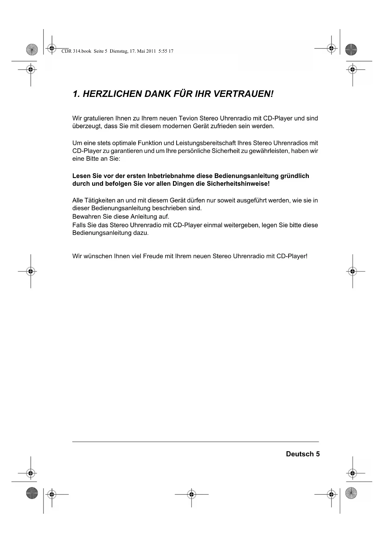 Wir gratulieren Ihnen zu Ihrem neuen Tevion Stereo Uhrenradio mit CD-Player und sind überzeugt, dass Sie mit diesem modernen Gerät zufrieden sein werden. Um eine stets optimale Funktion und Leistungsbereitschaft Ihres Stereo Uhrenradios mit CD-Player zu garantieren und um Ihre persönliche Sicherheit zu gewährleisten, haben wir eine Bitte an Sie: Lesen Sie vor der ersten Inbetriebnahme diese Bedienungsanleitung gründlich durch und befolgen Sie vor allen Dingen die Sicherheitshinweise! Alle Tätigkeiten an und mit diesem Gerät dürfen nur soweit ausgeführt werden, wie sie in dieser Bedienungsanleitung beschrieben sind. Bewahren Sie diese Anleitung auf. Falls Sie das Stereo Uhrenradio mit CD-Player einmal weitergeben, legen Sie bitte diese Bedienungsanleitung dazu. Wir wünschen Ihnen viel Freude mit Ihrem neuen Stereo Uhrenradio mit CD-Player! CDR 314.book Seite 5 Dienstag, 17. Mai 2011 5:55 176 Deutsch