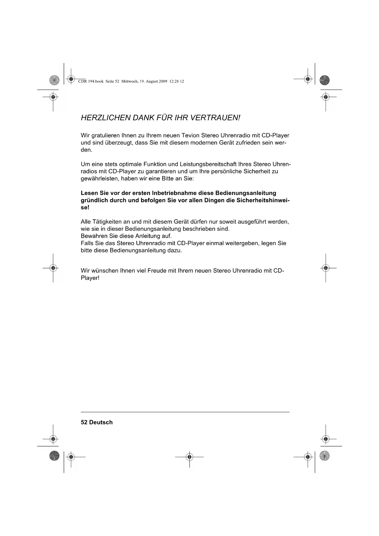 CDR 194.book Seite 51 Mittwoch, 19. August 2009 12:28 1252 Deutsch HERZLICHEN DANK FÜR IHR VERTRAUEN! Wir gratulieren Ihnen zu Ihrem neuen Tevion Stereo Uhrenradio mit CD-Player und sind überzeugt, dass Sie mit diesem modernen Gerät zufrieden sein wer- den. Um eine stets optimale Funktion und Leistungsbereitschaft Ihres Stereo Uhren- radios mit CD-Player zu garantieren und um Ihre persönliche Sicherheit zu gewährleisten, haben wir eine Bitte an Sie: Lesen Sie vor der ersten Inbetriebnahme diese Bedienungsanleitung gründlich durch und befolgen Sie vor allen Dingen die Sicherheitshinwei- se! Alle Tätigkeiten an und mit diesem Gerät dürfen nur soweit ausgeführt werden, wie sie in dieser Bedienungsanleitung beschrieben sind. Bewahren Sie diese Anleitung auf. Falls Sie das Stereo Uhrenradio mit CD-Player einmal weitergeben, legen Sie bitte diese Bedienungsanleitung dazu. Wir wünschen Ihnen viel Freude mit Ihrem neuen Stereo Uhrenradio mit CD- Player! CDR 194.book Seite 52 Mittwoch, 19. August 2009 12:28 12Deutsch 53