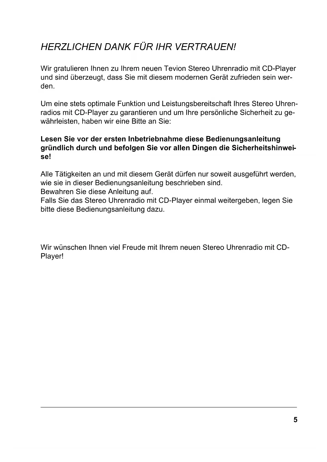 CDR 2009.book Seite 4 Donnerstag, 25. September 2008 3:46 155 HERZLICHEN DANK FÜR IHR VERTRAUEN! Wir gratulieren Ihnen zu Ihrem neuen Tevion Stereo Uhrenradio mit CD-Player und sind überzeugt, dass Sie mit diesem modernen Gerät zufrieden sein wer