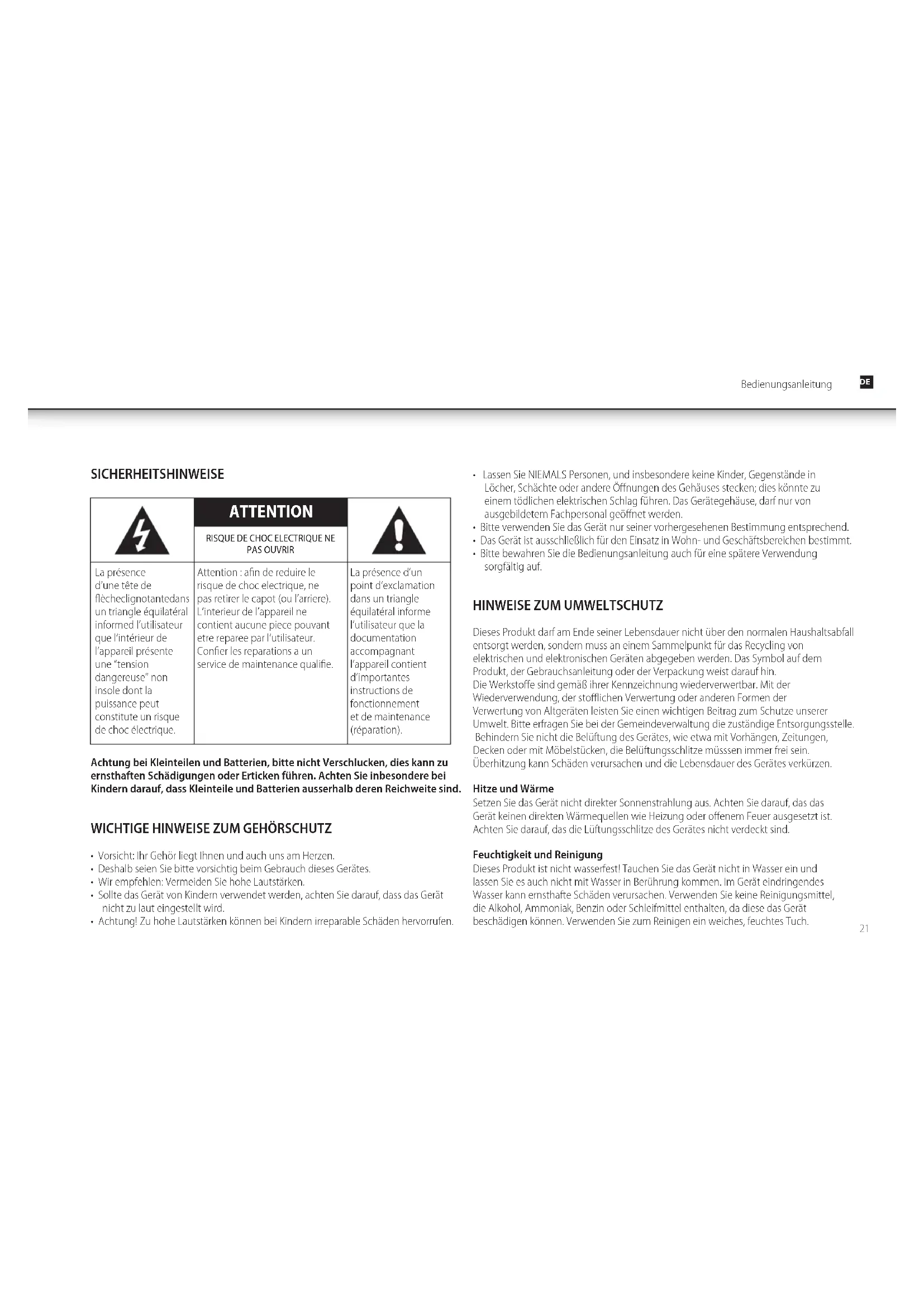 - WARNING: Offnen Sie keinesfalls das Gerät, sondern wenden sich mit Reparaturen oder Wartungen stets an einen autorisierten Kundendienst.
