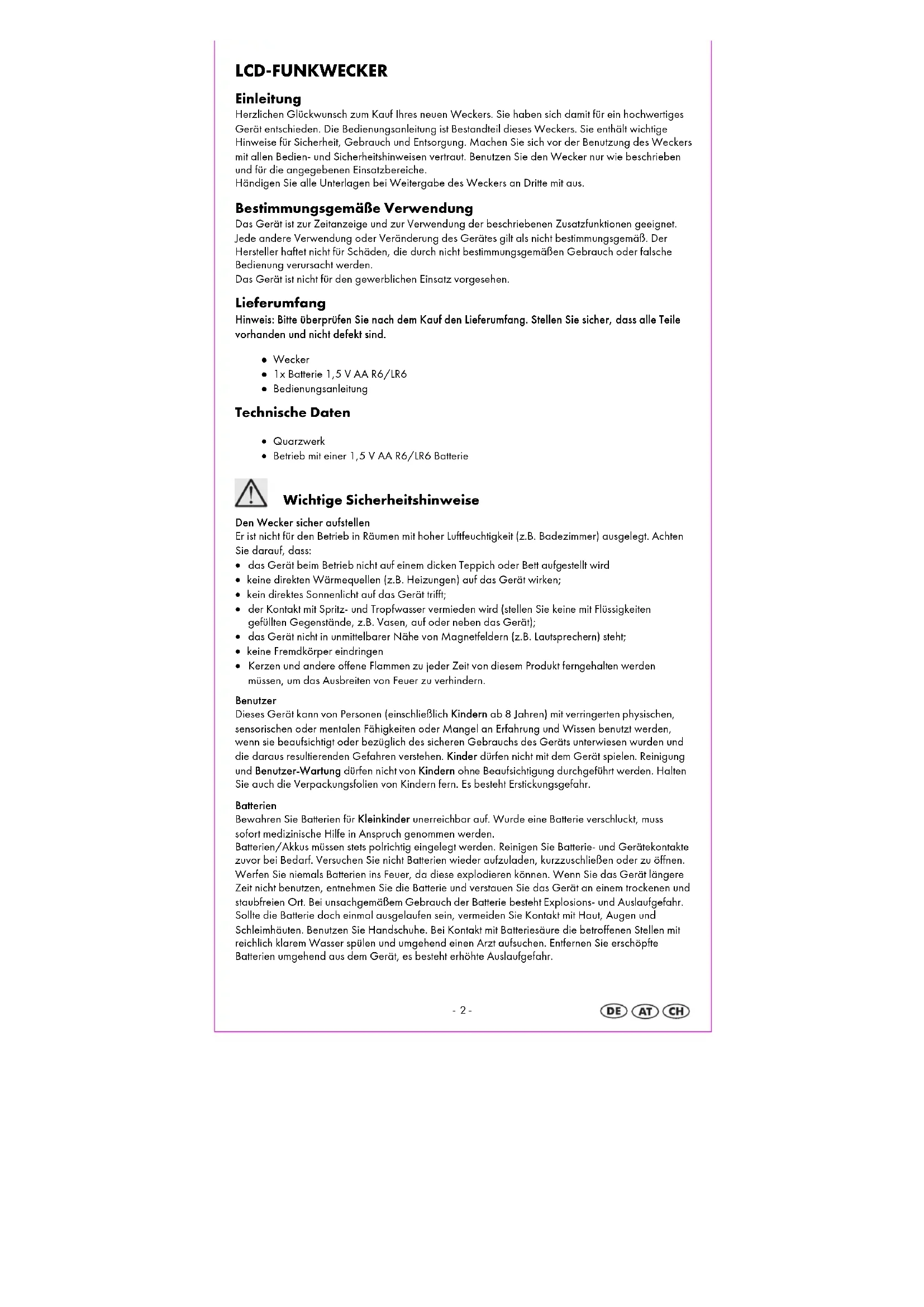 LCD-FUNKWECKER Einleitung Herzlichen Glückwunsch zum Kauf Ihres neuen Weckers. Sie haben sich damit für ein hochwertiges Gerät entschieden. Die Bedienungsanleitung ist Bestandteil dieses Weckers. Sie enthält wichtige Hinweise für Sicherheit, Gebrauch und Entsorgung. Machen Sie sich vor der Benutzung des Weckers mit allen Bedien- und Sicherheitshinweisen vertraut. Benutzen Sie den Wecker nur wie beschrieben und für die angegebenen Einsatzbereiche. Händigen Sie alle Unterlagen bei Weitergabe des Weckers an Dritte mit aus. Bestimmungsgemäße Verwendung Das Gerät ist zur Zeitanzeige und zur Verwendung der beschriebenen Zusatzfunktionen geeignet. Jede andere Verwendung oder Veränderung des Gerätes gilt als nicht bestimmungsgemäß. Der Hersteller haftet nicht für Schäden, die durch nicht bestimmungsgemäßen Gebrauch oder falsche Bedienung verursacht werden. Das Gerät ist nicht für den gewerblichen Einsatz vorgesehen. Lieferumfang Hinweis: Bitte überprüfen Sie nach dem Kauf den Lieferumfang. Stellen Sie sicher, dass alle Teile vorhanden und nicht defekt sind.