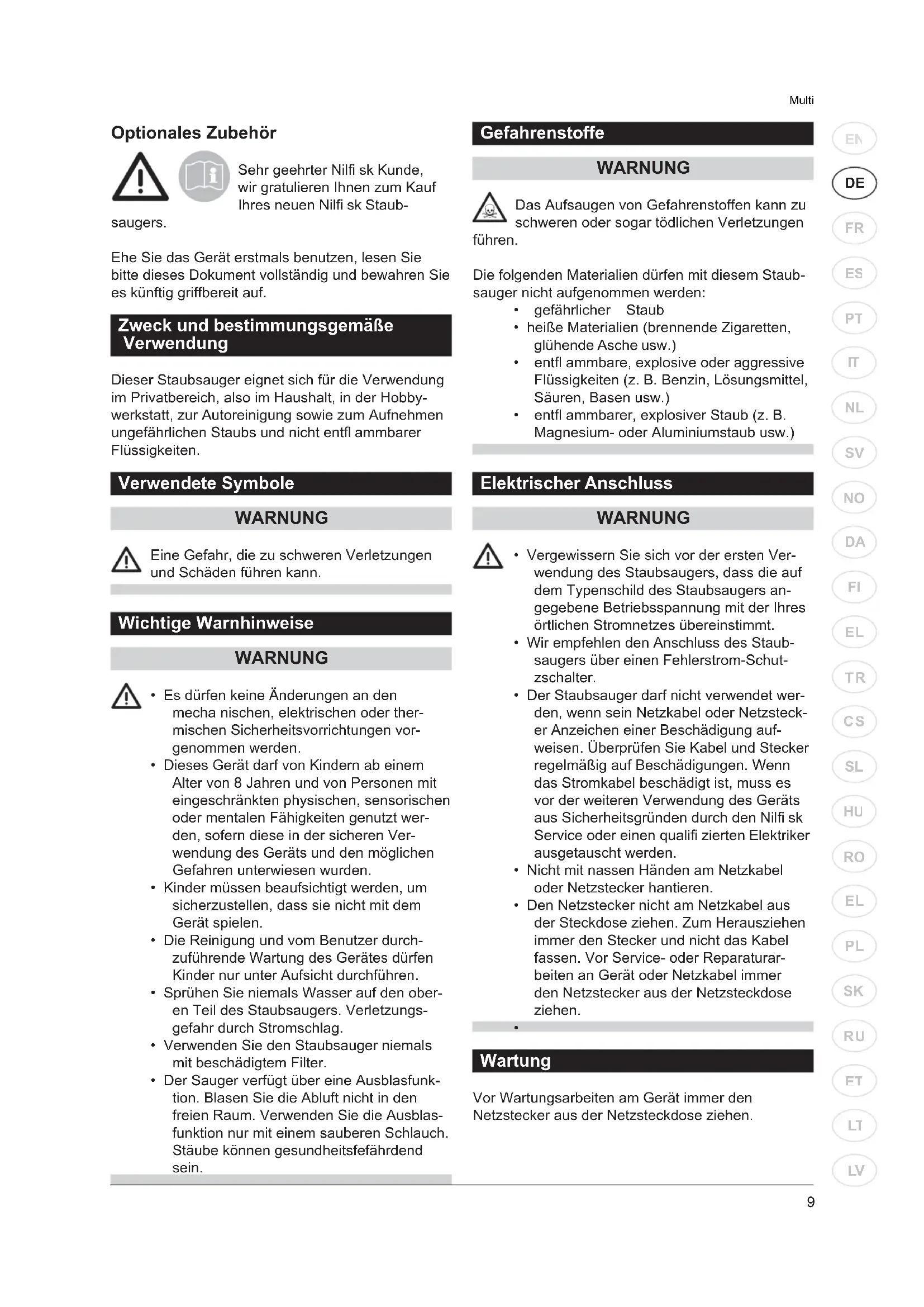 Optionales Zubehör Sehr geehrter Nilfi sk Kunde, wir gratulieren Ihnen zum Kauf Ihres neuen Nilfi sk Staub- saugers. Ehe Sie das Gerät erstmals benutzen, lesen Sie bitte dieses Dokument vollständig und bewahren Sie es künftig griffbereit auf. Zweck und bestimmungsgemäße Verwendung Dieser Staubsauger eignet sich für die Verwendung im Privatbereich, also im Haushalt, in der Hobby- werkstatt, zur Autoreinigung sowie zum Aufnehmen ungefährlichen Staubs und nicht entfl ammbarer Flüssigkeiten. Verwendete Symbole WARNUNG Eine Gefahr, die zu schweren Verletzungen und Schäden führen kann. Wichtige Warnhinweise WARNUNG