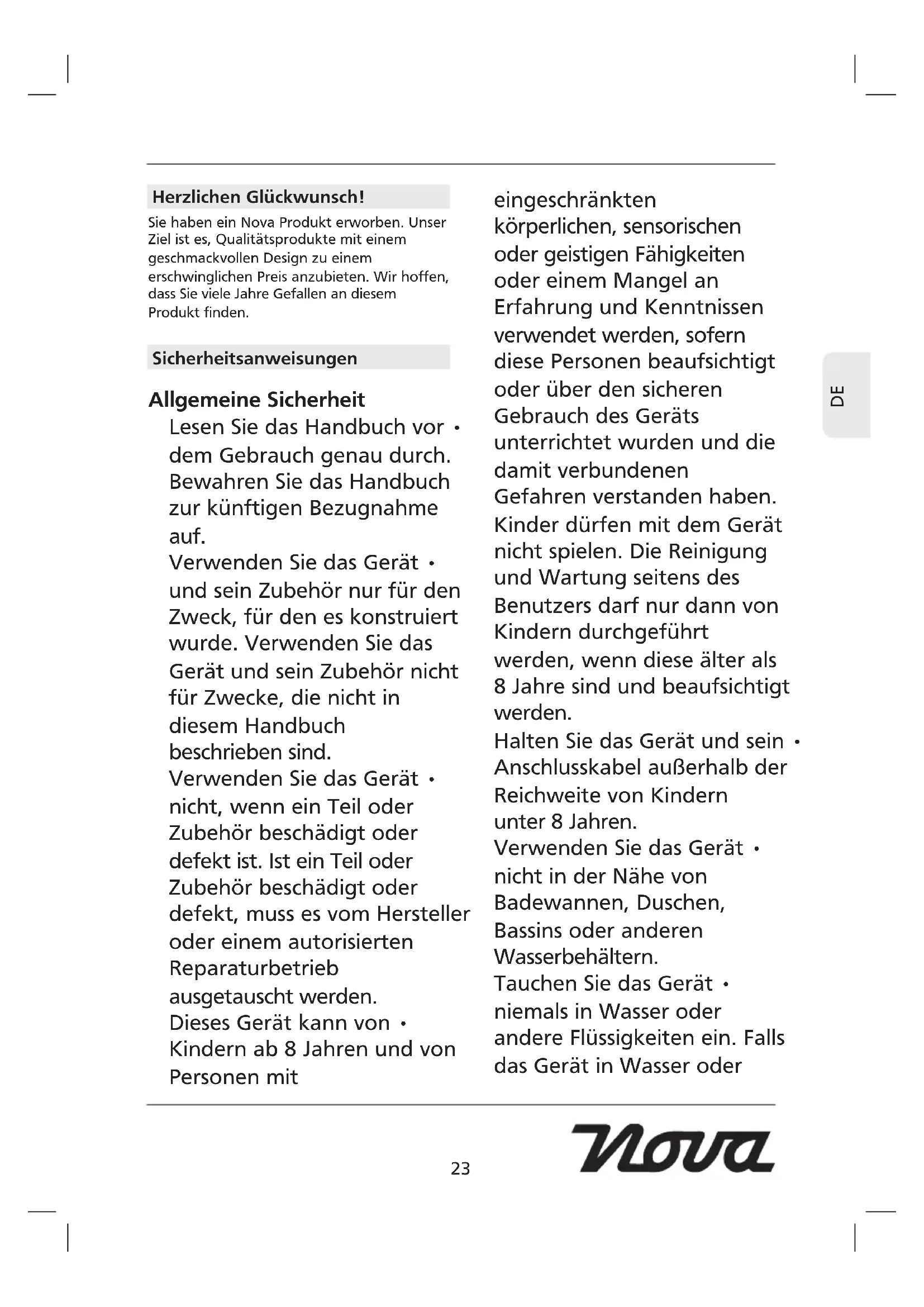 Herzlichen Glückwunsch! Sie haben ein Nova Produkt erworben. Unser Ziel ist es, Qualitätsprodukte mit einem geschmackvollen Design zu einem erschwinglichen Preis anzubieten. Wir hoffen, dass Sie viele Jahre Gefallen an diesem Produkt finden. Sicherheitsanweisungen Allgemeine Sicherheit Lesen Sie das Handbuch vor • dem Gebrauch genau durch. Bewahren Sie das Handbuch zur künftigen Bezugnahme auf. Verwenden Sie das Gerät • und sein Zubehör nur für den Zweck, für den es konstruiert wurde. Verwenden Sie das Gerät und sein Zubehör nicht für Zwecke, die nicht in diesem Handbuch beschrieben sind. Verwenden Sie das Gerät • nicht, wenn ein Teil oder Zubehör beschädigt oder defekt ist. Ist ein Teil oder Zubehör beschädigt oder defekt, muss es vom Hersteller oder einem autorisierten Reparaturbetrieb ausgetauscht werden. Dieses Gerät kann von • Kindern ab 8 Jahren und von Personen mit eingeschränkten körperlichen, sensorischen oder geistigen Fähigkeiten oder einem Mangel an Erfahrung und Kenntnissen verwendet werden, sofern diese Personen beaufsichtigt oder über den sicheren Gebrauch des Geräts unterrichtet wurden und die damit verbundenen Gefahren verstanden haben. Kinder dürfen mit dem Gerät nicht spielen. Die Reinigung und Wartung seitens des Benutzers darf nur dann von Kindern durchgeführt werden, wenn diese älter als 8 Jahre sind und beaufsichtigt werden. Halten Sie das Gerät und sein • Anschlusskabel außerhalb der Reichweite von Kindern unter 8 Jahren. Verwenden Sie das Gerät • nicht in der Nähe von Badewannen, Duschen, Bassins oder anderen Wasserbehältern. Tauchen Sie das Gerät • niemals in Wasser oder andere Flüssigkeiten ein. Falls das Gerät in Wasser oder24