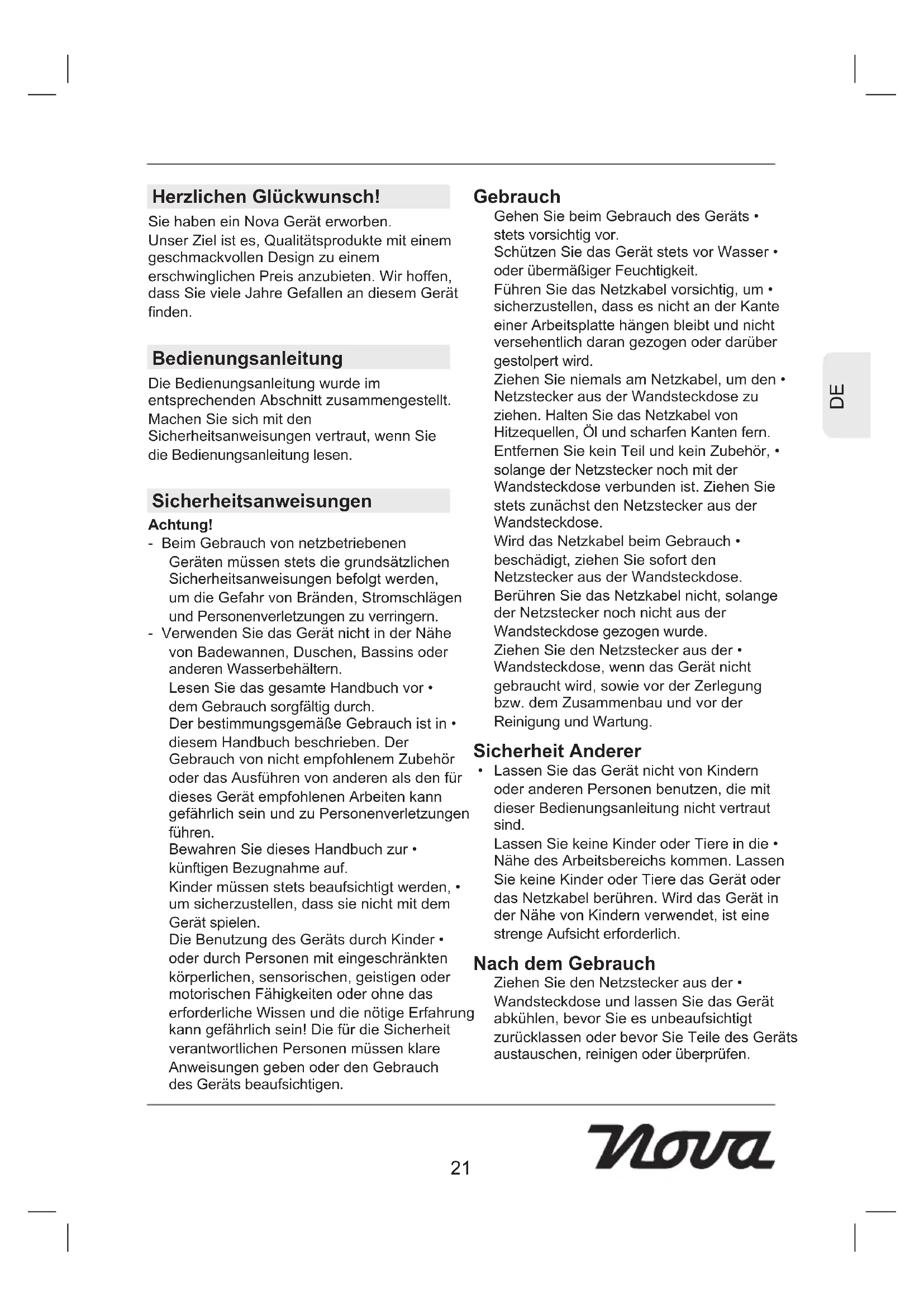 Herzlichen Glückwunsch! Sie haben ein Nova Gerät erworben. Unser Ziel ist es, Qualitätsprodukte mit einem geschmackvollen Design zu einem erschwinglichen Preis anzubieten. Wir hoffen, dass Sie viele Jahre Gefallen an diesem Gerät finden. Bedienungsanleitung Die Bedienungsanleitung wurde im entsprechenden Abschnitt zusammengestellt. Machen Sie sich mit den Sicherheitsanweisungen vertraut, wenn Sie die Bedienungsanleitung lesen. Sicherheitsanweisungen Achtung! - Beim Gebrauch von netzbetriebenen Geräten müssen stets die grundsätzlichen Sicherheitsanweisungen befolgt werden, um die Gefahr von Bränden, Stromschlägen und Personenverletzungen zu verringern. - Verwenden Sie das Gerät nicht in der Nähe von Badewannen, Duschen, Bassins oder anderen Wasserbehältern. Lesen Sie das gesamte Handbuch vor • dem Gebrauch sorgfältig durch. Der bestimmungsgemäße Gebrauch ist in • diesem Handbuch beschrieben. Der Gebrauch von nicht empfohlenem Zubehör oder das Ausführen von anderen als den für dieses Gerät empfohlenen Arbeiten kann gefährlich sein und zu Personenverletzungen führen. Bewahren Sie dieses Handbuch zur • künftigen Bezugnahme auf. Kinder müssen stets beaufsichtigt werden, • um sicherzustellen, dass sie nicht mit dem Gerät spielen. Die Benutzung des Geräts durch Kinder • oder durch Personen mit eingeschränkten körperlichen, sensorischen, geistigen oder motorischen Fähigkeiten oder ohne das erforderliche Wissen und die nötige Erfahrung kann gefährlich sein! Die für die Sicherheit verantwortlichen Personen müssen klare Anweisungen geben oder den Gebrauch des Geräts beaufsichtigen. Gebrauch Gehen Sie beim Gebrauch des Geräts • stets vorsichtig vor. Schützen Sie das Gerät stets vor Wasser • oder übermäßiger Feuchtigkeit. Führen Sie das Netzkabel vorsichtig, um • sicherzustellen, dass es nicht an der Kante einer Arbeitsplatte hängen bleibt und nicht versehentlich daran gezogen oder darüber gestolpert wird. Ziehen Sie niemals am Netzkabel, um den • Netzstecker aus der Wandsteckdose zu ziehen. Halten Sie das Netzkabel von Hitzequellen, Öl und scharfen Kanten fern. Entfernen Sie kein Teil und kein Zubehör, • solange der Netzstecker noch mit der Wandsteckdose verbunden ist. Ziehen Sie stets zunächst den Netzstecker aus der Wandsteckdose. Wird das Netzkabel beim Gebrauch • beschädigt, ziehen Sie sofort den Netzstecker aus der Wandsteckdose. Berühren Sie das Netzkabel nicht, solange der Netzstecker noch nicht aus der Wandsteckdose gezogen wurde. Ziehen Sie den Netzstecker aus der • Wandsteckdose, wenn das Gerät nicht gebraucht wird, sowie vor der Zerlegung bzw. dem Zusammenbau und vor der Reinigung und Wartung. Sicherheit Anderer Lassen Sie das Gerät nicht von Kindern • oder anderen Personen benutzen, die mit dieser Bedienungsanleitung nicht vertraut sind. Lassen Sie keine Kinder oder Tiere in die • Nähe des Arbeitsbereichs kommen. Lassen Sie keine Kinder oder Tiere das Gerät oder das Netzkabel berühren. Wird das Gerät in der Nähe von Kindern verwendet, ist eine strenge Aufsicht erforderlich. Nach dem Gebrauch Ziehen Sie den Netzstecker aus der • Wandsteckdose und lassen Sie das Gerät abkühlen, bevor Sie es unbeaufsichtigt zurücklassen oder bevor Sie Teile des Geräts austauschen, reinigen oder überprüfen.2222
