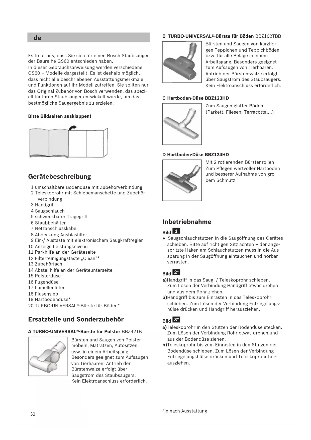 nd Funktionen auf Ihr Modell zutreffen. Sie sollten nur das Original Zubehör von Bosch verwenden, das spezi- ell für Ihren Staubsauger entwickelt wurde, um das bestmögliche Saugergebnis zu erzielen. Bitte Bildseiten ausklappen! Gerätebeschreibung 1 umschaltbare Bodendüse mit Zubehörverbindung 2 Teleskoprohr mit Schiebemanschette und Zubehör verbindung 3 Handgriff 4 Saugschlauch 5 schwenkbarer Tragegriff 6 Staubbehälter 7 Netzanschlusskabel 8 Abdeckung Ausblasfilter 9 Ein-/ Austaste mit elektronischem Saugkraftregler 10 Anzeige Leistungsniveau 11 Parkhilfe an der Geräteseite 12 Filterreinigungstaste „Clean“* 13 Zubehörfach 14 Abstellhilfe an der Geräteunterseite 15 Polsterdüse 16 Fugendüse 17 Lamellenfilter 18 Flusensieb 19 Hartbodendüse* 20 TURBO-UNIVERSAL®-Bürste für Böden* Ersatzteile und Sonderzubehör A TURBO-UNIVERSAL®-Bürste für Polster BBZ42TB Bürsten und Saugen von Polster- möbeln, Matratzen, Autositzen, usw. in einem Arbeitsgang. Besonders geeignet zum Aufsaugen von Tierhaaren. Antrieb der Bürstenwalze erfolgt über Saugstrom des Staubsaugers. Kein Elektroanschluss erforderlich. *je nach Ausstattung