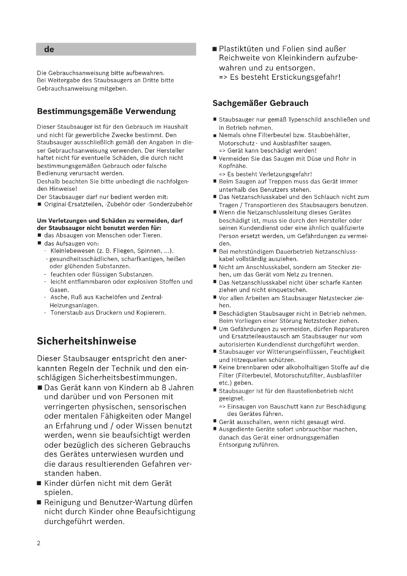 edienung verursacht werden. Deshalb beachten Sie bitte unbedingt die nachfolgen- den Hinweise! Der Staubsauger darf nur bedient werden mit: Original-Ersatzteilen, -Zubehör oder -Sonderzubehör Um Verletzungen und Schäden zu vermeiden, darf der Staubsauger nicht benutzt werden für: das Absaugen von Menschen oder Tieren. das Aufsaugen von: - Kleinlebewesen (z. B. Fliegen, Spinnen, ...). - gesundheitsschädlichen, scharfkantigen, heißen oder glühenden Substanzen. - feuchten oder flüssigen Substanzen. - leicht entflammbaren oder explosiven Stoffen und Gasen. - Asche, Ruß aus Kachelöfen und Zentral- Heizungsanlagen. - Tonerstaub aus Druckern und Kopierern. Sicherheitshinweise Dieser Staubsauger entspricht den aner- kannten Regeln der Technik und den ein- schlägigen Sicherheitsbestimmungen. Das Gerät kann von Kindern ab 8 Jahren und darüber und von Personen mit verringerten physischen, sensorischen oder mentalen Fähigkeiten oder Mangel an Erfahrung und / oder Wissen benutzt werden, wenn sie beaufsichtigt werden oder bezüglich des sicheren Gebrauchs des Gerätes unterwiesen wurden und die daraus resultierenden Gefahren ver- standen haben. Kinder dürfen nicht mit dem Gerät spielen. Reinigung und Benutzer-Wartung dürfen nicht durch Kinder ohne Beaufsichtigung durchgeführt werden. Plastiktüten und Folien sind außer Reichweite von Kleinkindern aufzube- wahren und zu entsorgen. => Es besteht Erstickungsgefahr! Sachgemäßer Gebrauch Staubsauger nur gemäß Typenschild anschließen und in Betrieb nehmen.